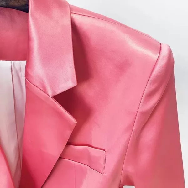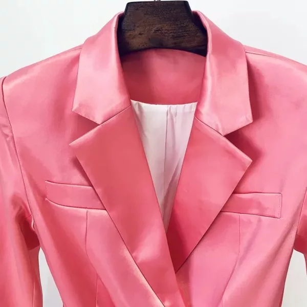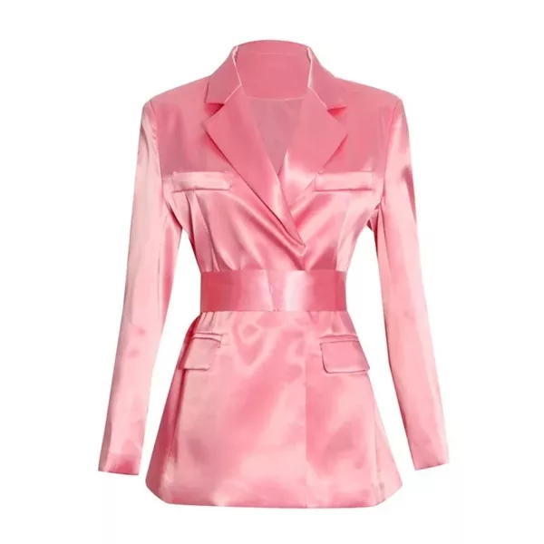 Make a statement with this belted pink satin blazer dress, combining sleek tailoring with vibrant elegance.