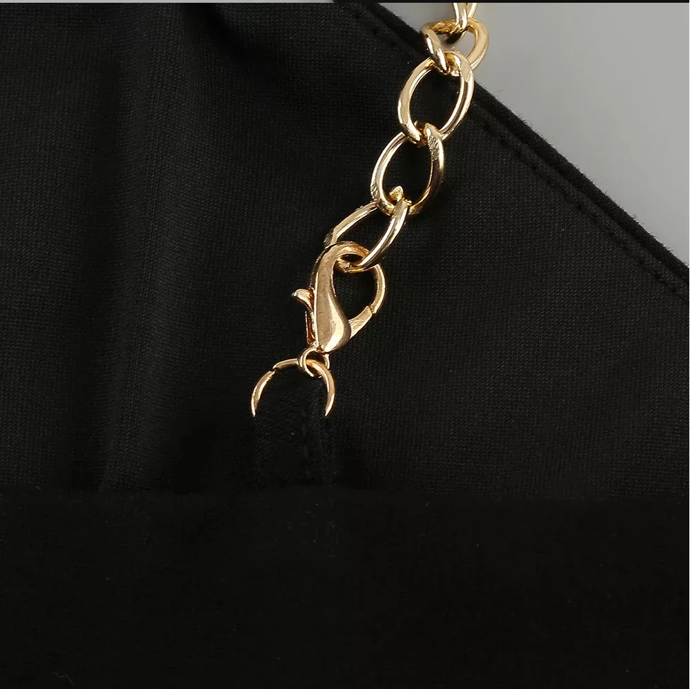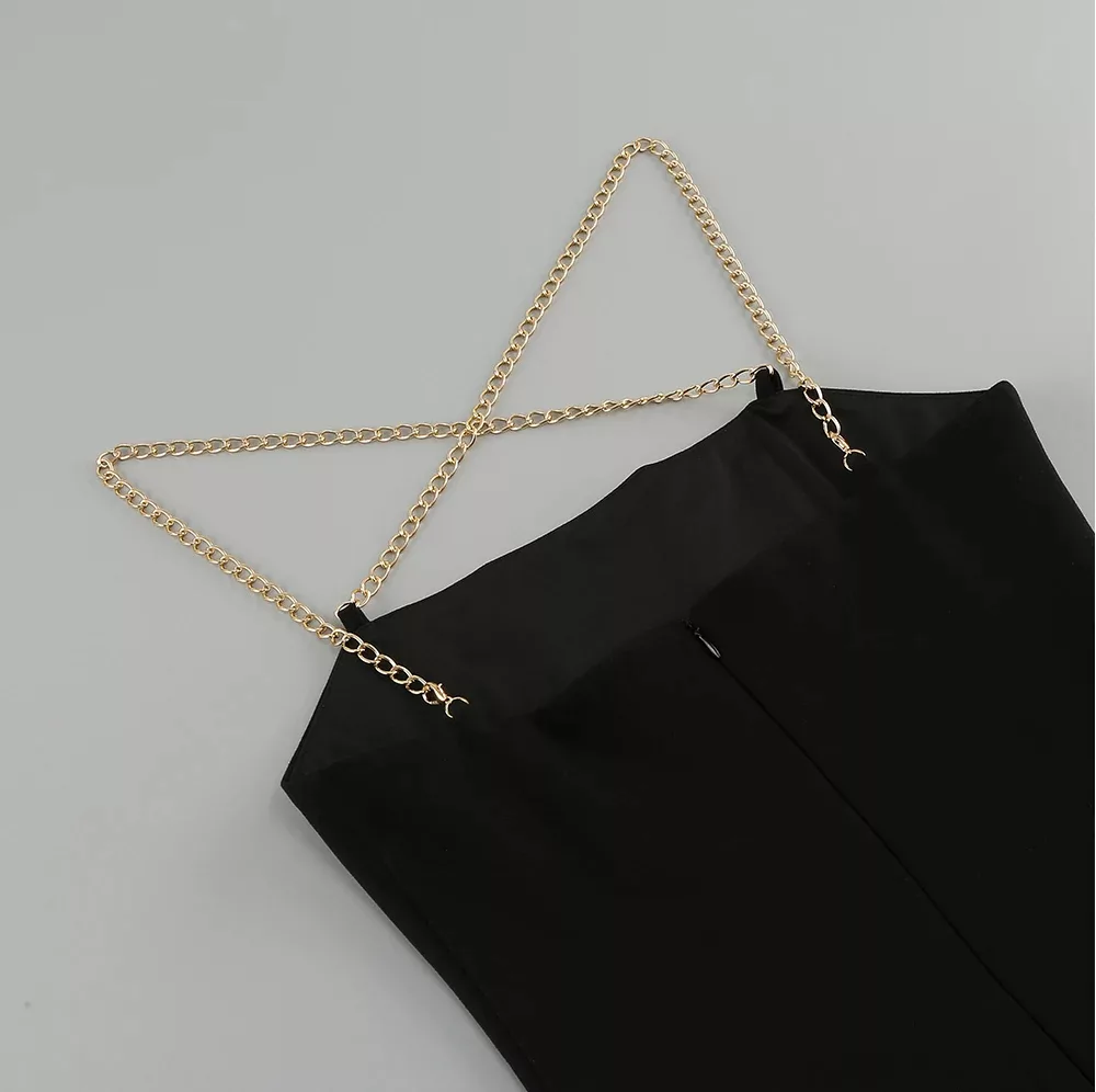 Whether you’re attending a formal event, a chic cocktail party, or simply want to make a lasting impression, this stunning dress offers versatility and timeless style. Pair it with minimal jewelry and stiletto heels to let the metal chain detailing and sleek silhouette take center stage. This dress is perfect for those who seek a unique, fashion-forward look that balances elegance and sensuality.