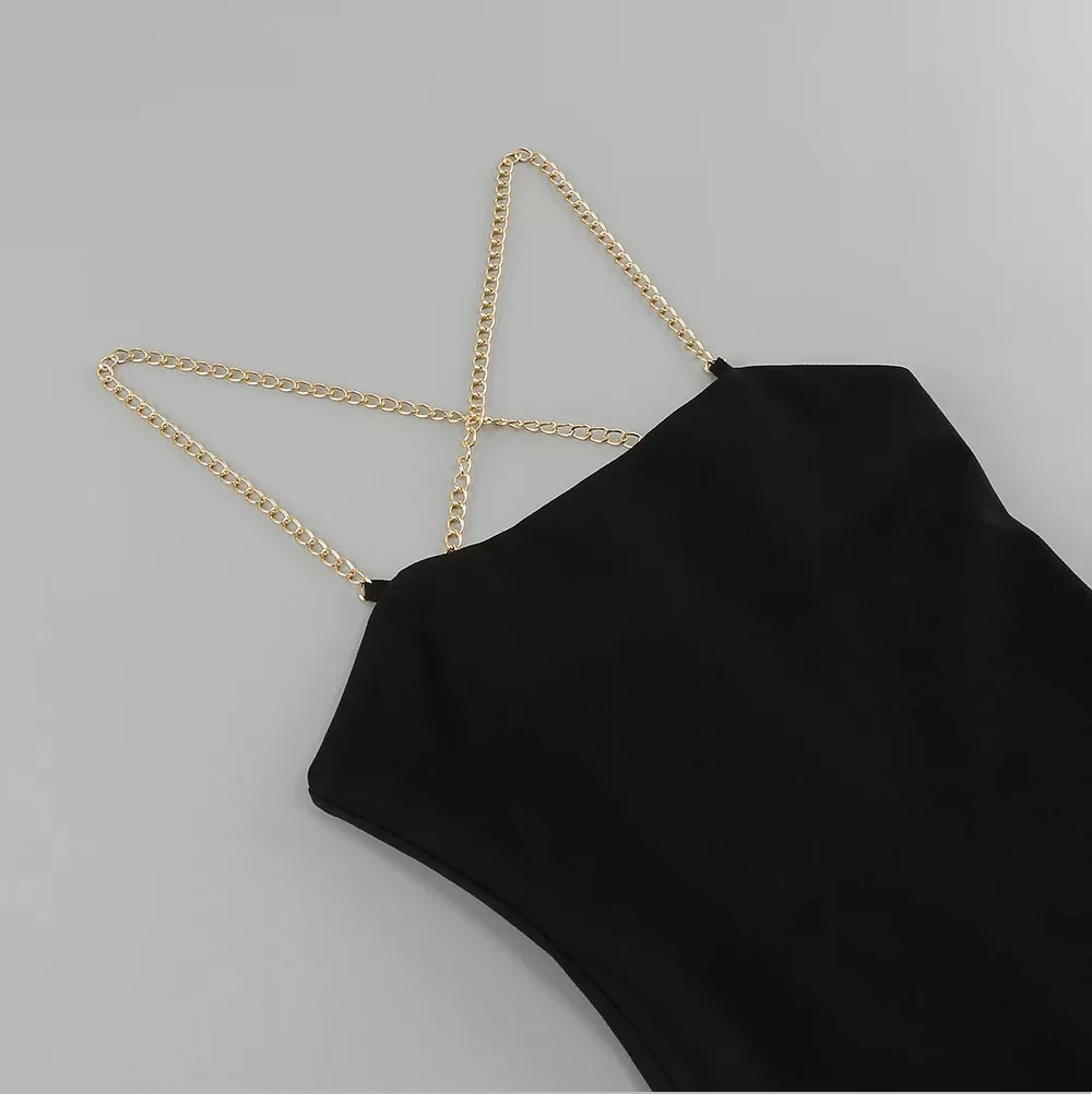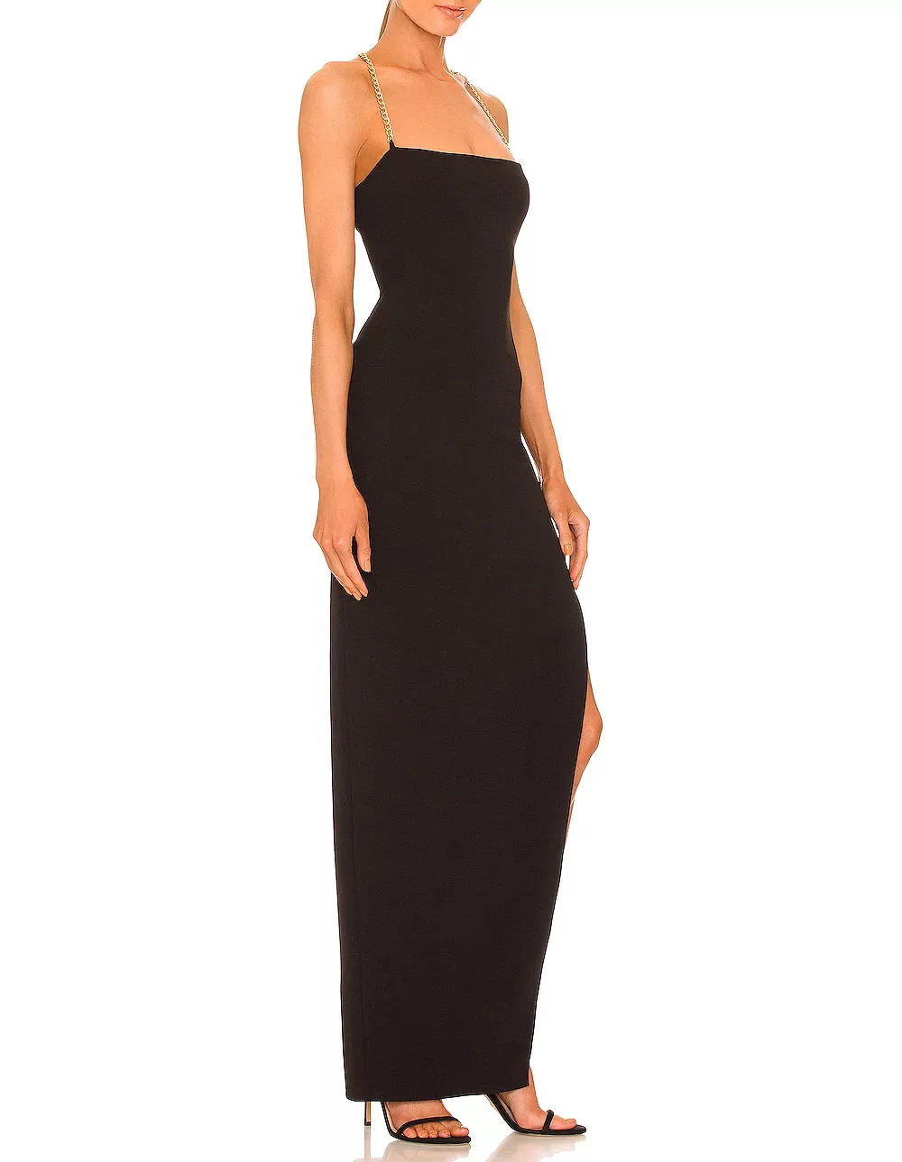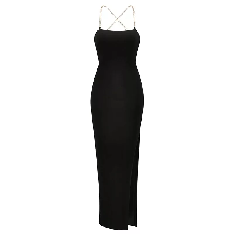 A black backless slip dress with metal chain straps and a side slit, designed to captivate at any party.