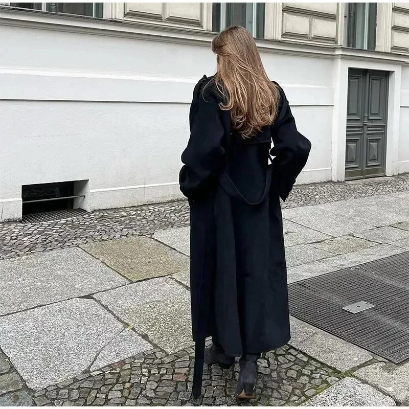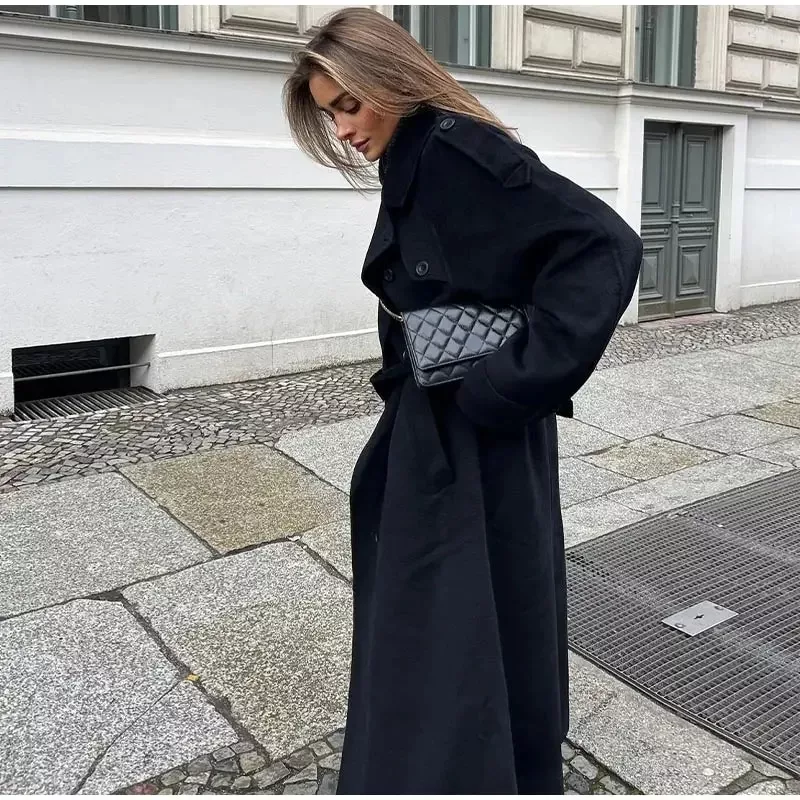 The Black Belted Long Coat combines timeless elegance with a structured silhouette, making it an essential layer for cooler weather. Its classic long design offers complete coverage, creating a sleek and flattering shape that easily complements a variety of outfits. This classic black long coat showcases wide lapels and a double-breasted button closure, adding structure to the relaxed, oversized fit. A waist belt gives the coat a customized fit, cinching in at the waist to accentuate the figure while maintaining a polished look.