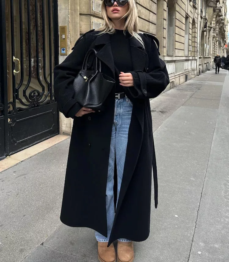With slightly voluminous sleeves, this black belted long coat brings a subtle touch of drama, elevating any outfit with ease. Thoughtfully crafted with intricate details like shoulder epaulettes and adjustable cuff straps, it speaks to quality and refined style. The coat’s length provides added warmth, while the double-breasted design ensures secure closure against the elements. Whether layered over office wear or paired with casual ensembles and stylish high heeled knee boots, this piece adds a sophisticated edge that’s versatile enough for everyday wear and polished enough for high-street outings.