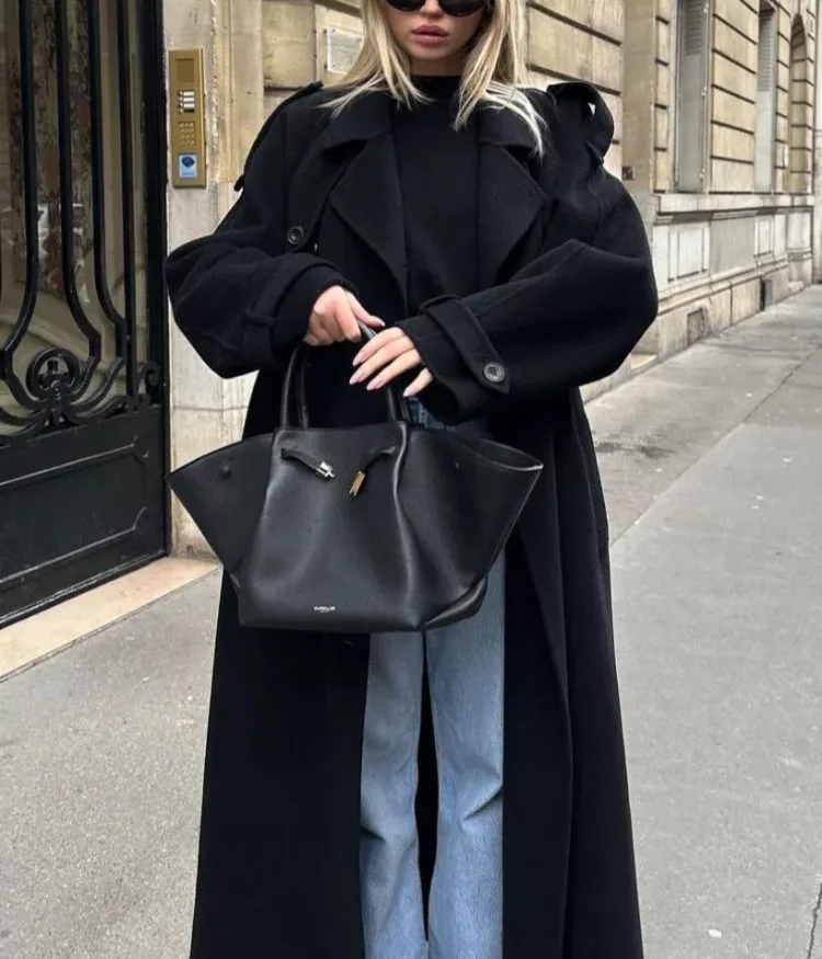 A versatile black coat with a belt for customizable style and a polished, sleek silhouette.