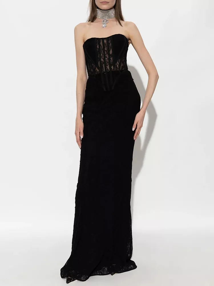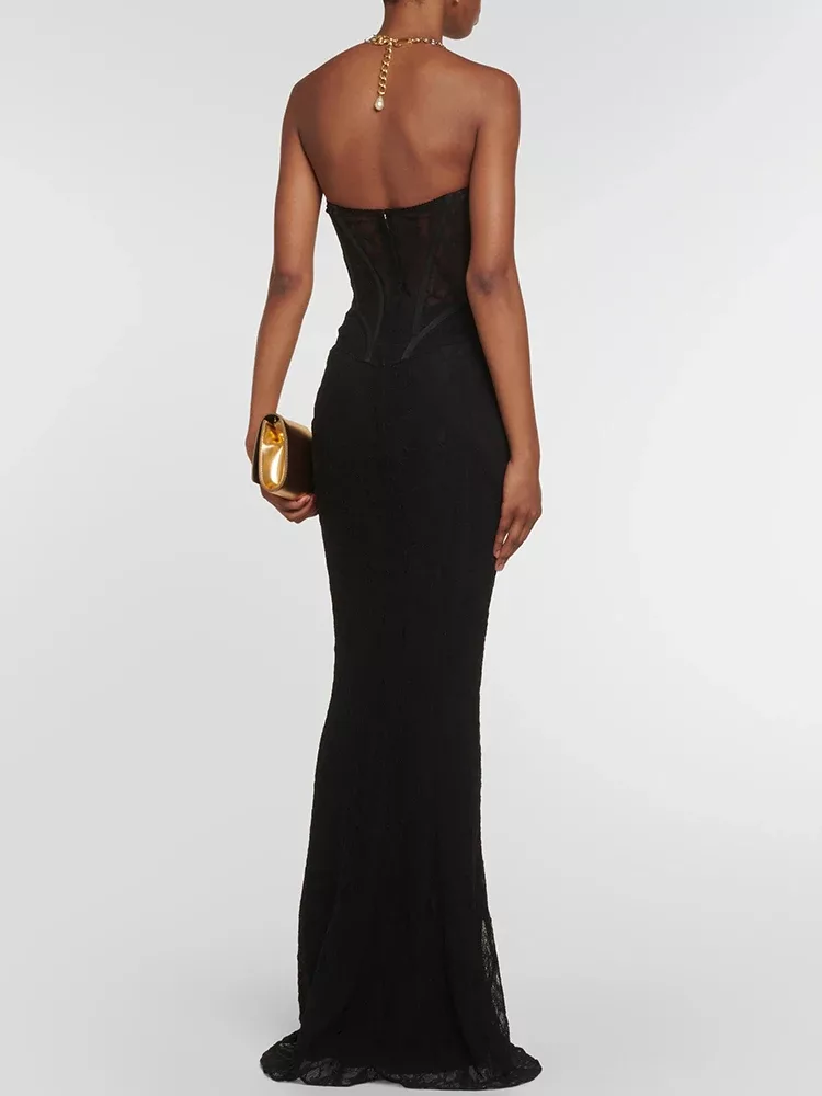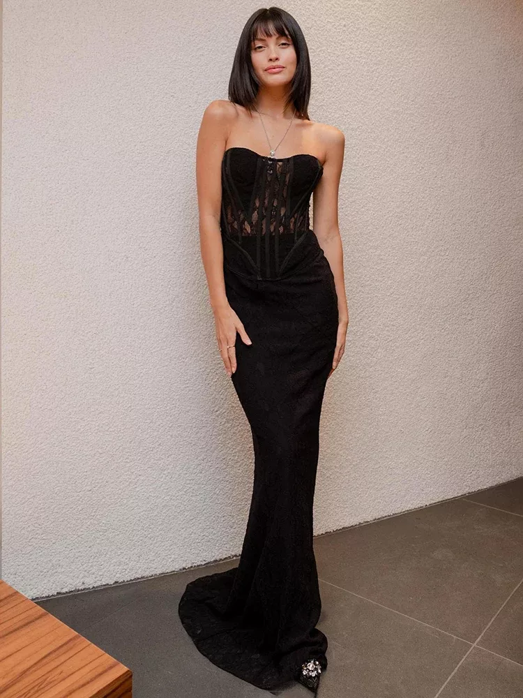 A stunning black corset lace dress set with a flowing maxi skirt, perfect for elegant evening events.