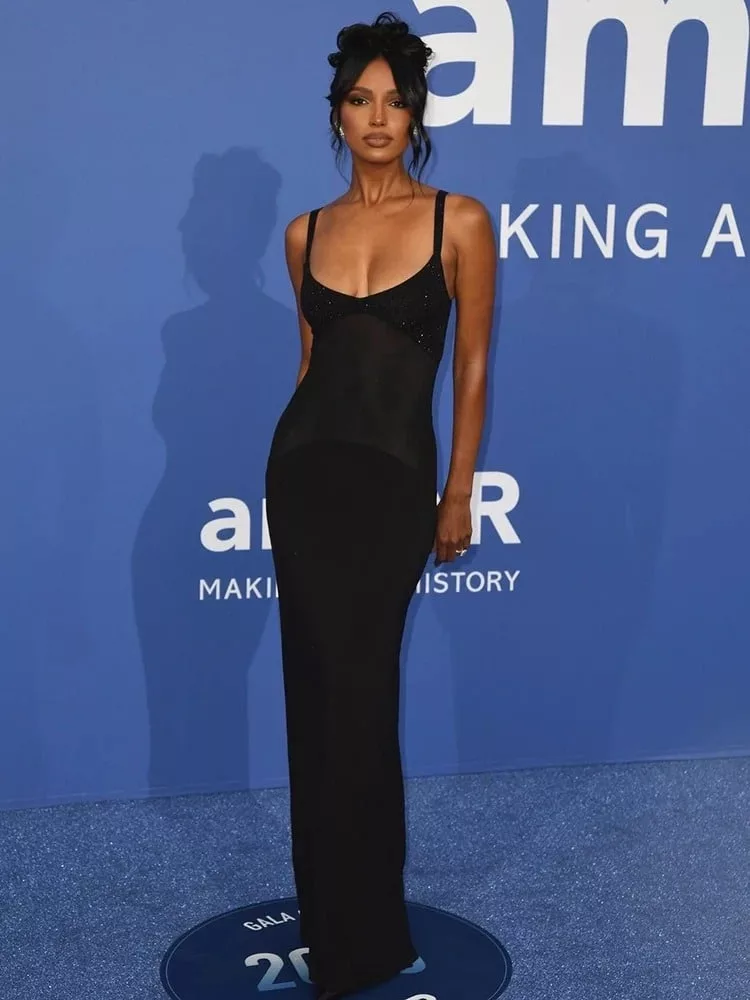 The true artistry of this dress lies in its captivating details. The delicate mesh bodice, subtly sheer, offers a tantalizing glimpse while maintaining an air of refined elegance. Adorned with shimmering embellishments across the bust, it catches the light with every movement, creating a radiant sparkle that ensures you’re the center of attention. The thin, elegant straps provide delicate support, enhancing the minimalist yet impactful design. This thoughtful blend of textures, the smooth, flowing skirt against the intricate, sparkling mesh—creates a dynamic visual appeal that is both modern and timeless.