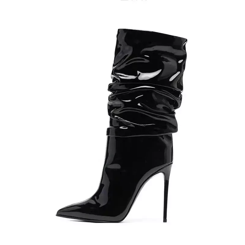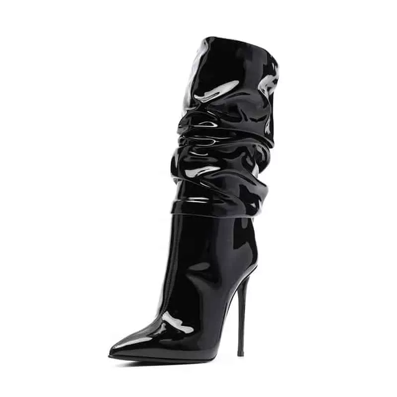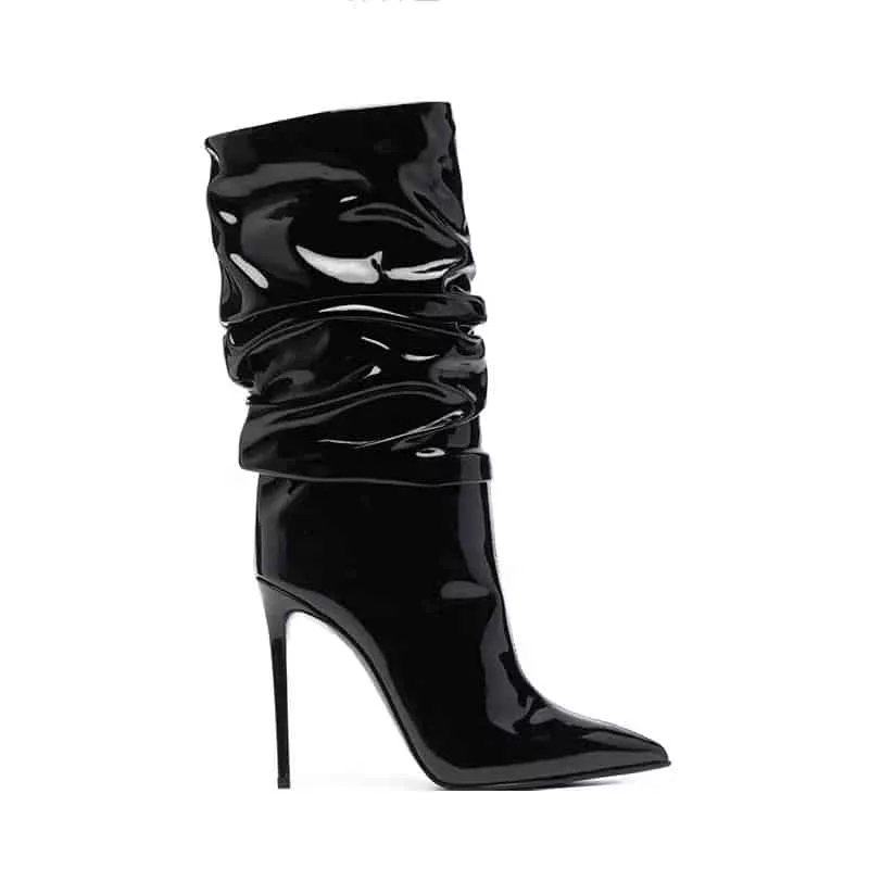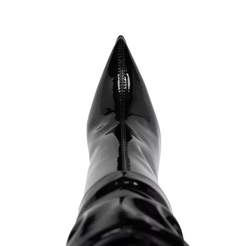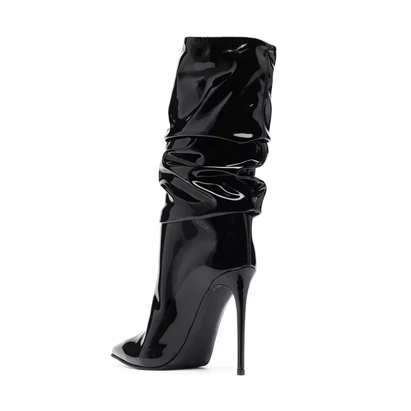 Glossy black patent stiletto boots with ruched design and pointed toe—ideal for adding dramatic elegance to any look.