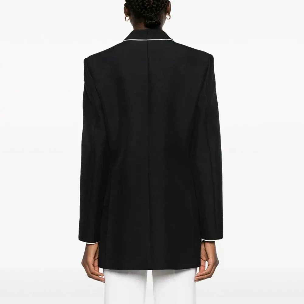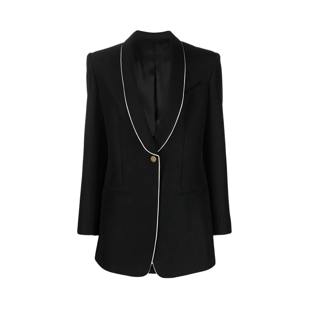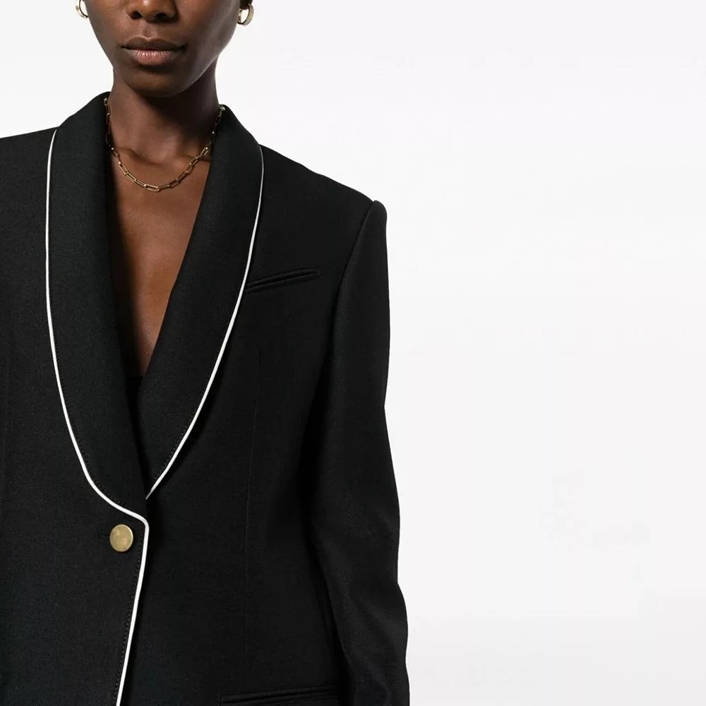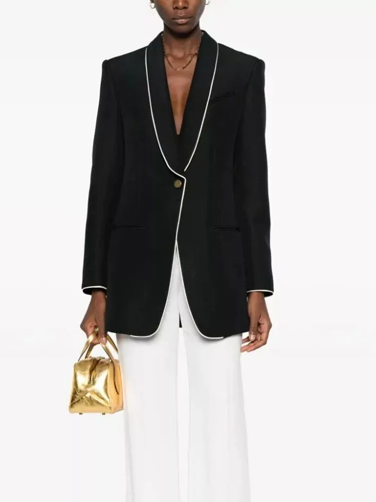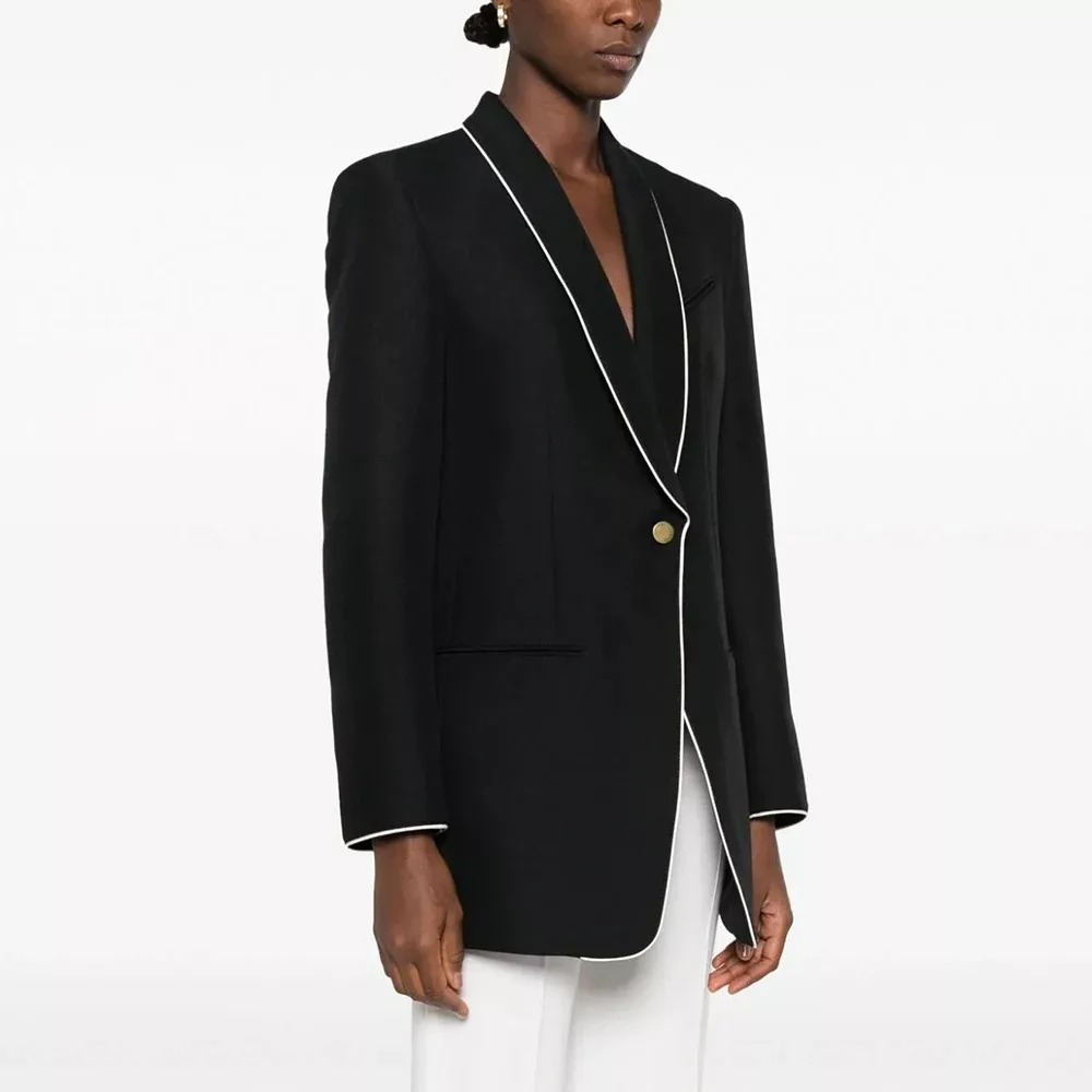 Sophisticated black blazer with white trimming and a shawl collar, perfect for minimalist style.