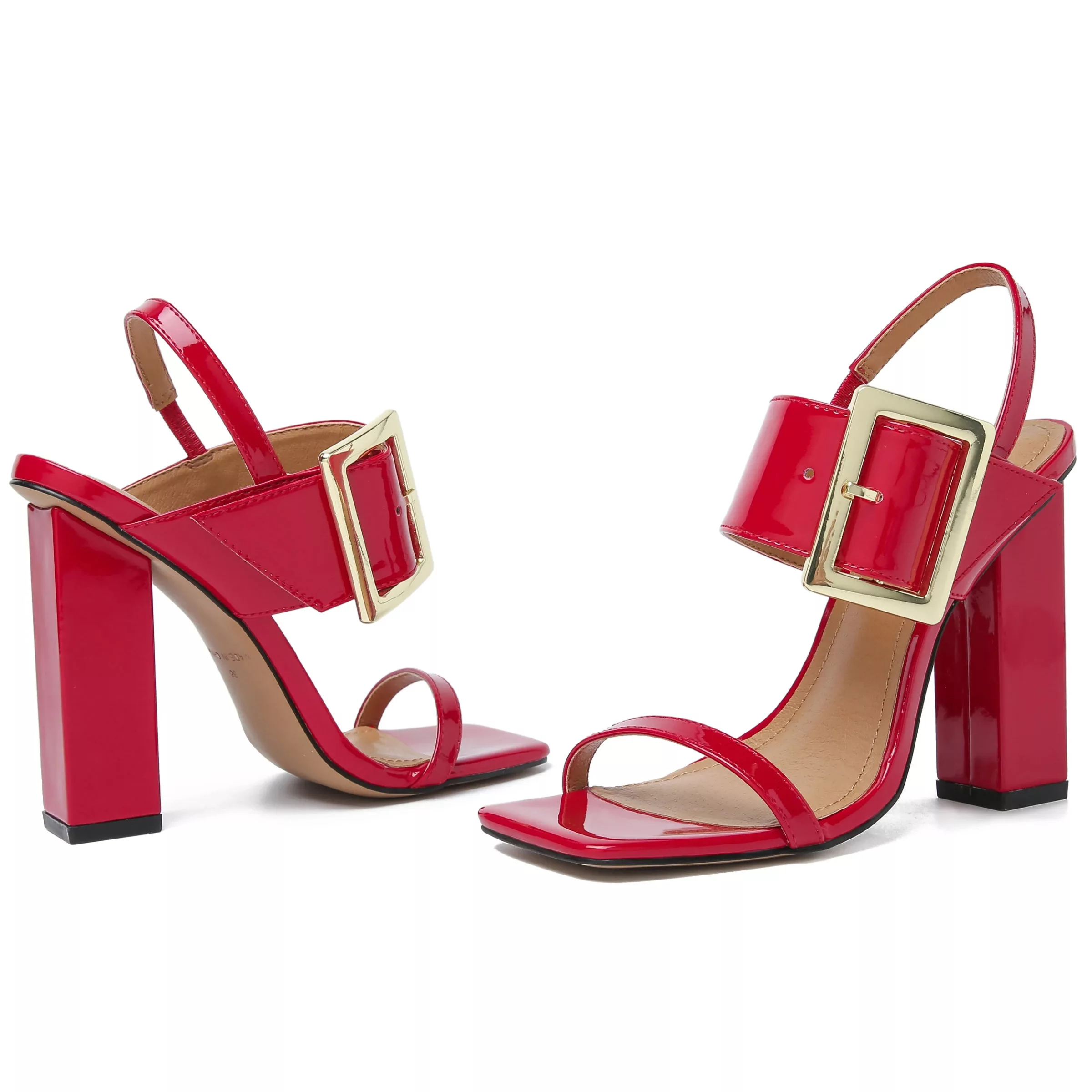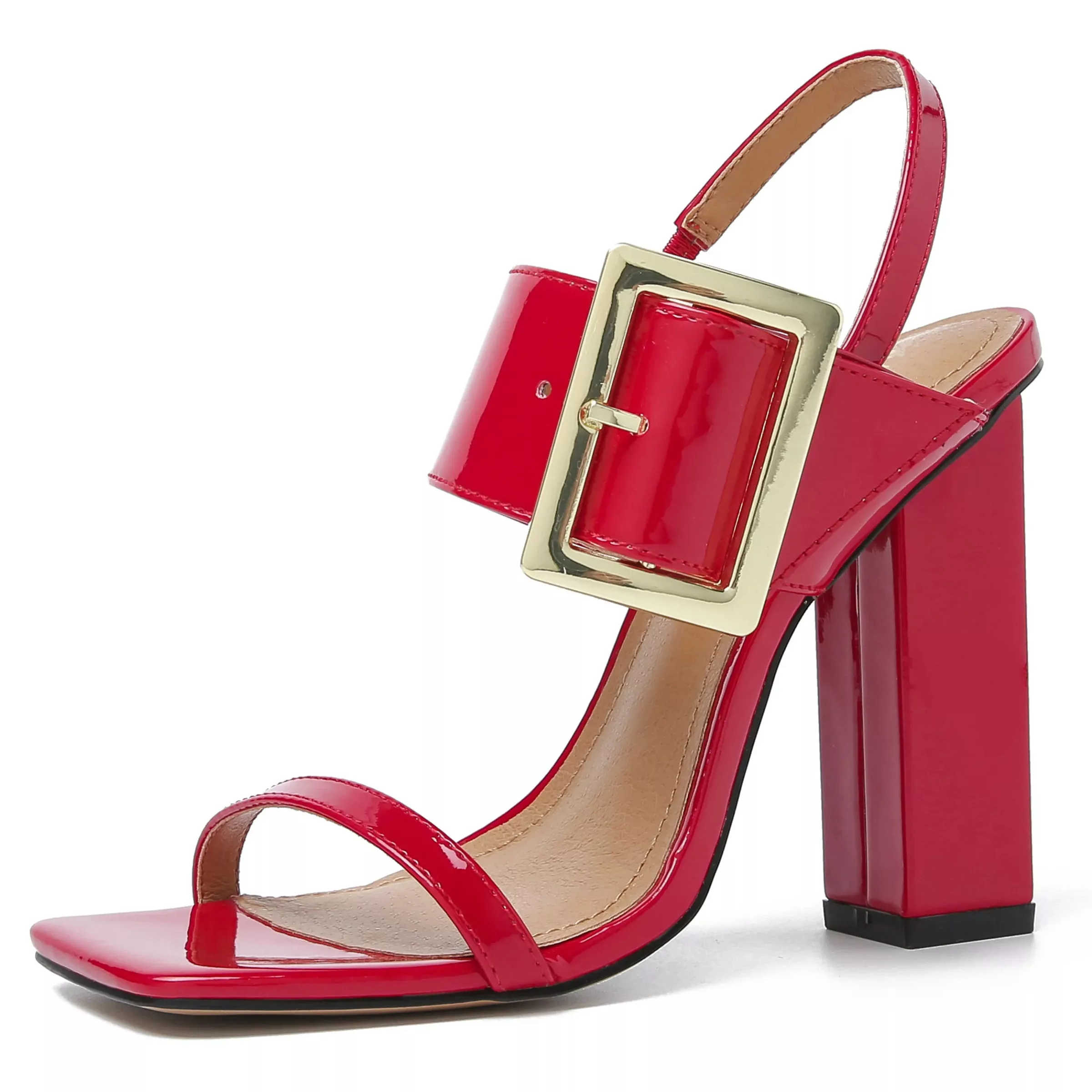 Designed with both style and comfort in mind, the sandals are set on a sturdy block heel, providing a comfortable lift and enhancing stability with each step. The distinctive square toe shape adds a modern twist, bringing a touch of avant-garde style to the classic high-heel sandal. The high-gloss finish, combined with the unique buckle and square toe, makes these sandals a versatile choice for everything from formal events to upscale evenings out, allowing you to create a polished and bold look effortlessly.