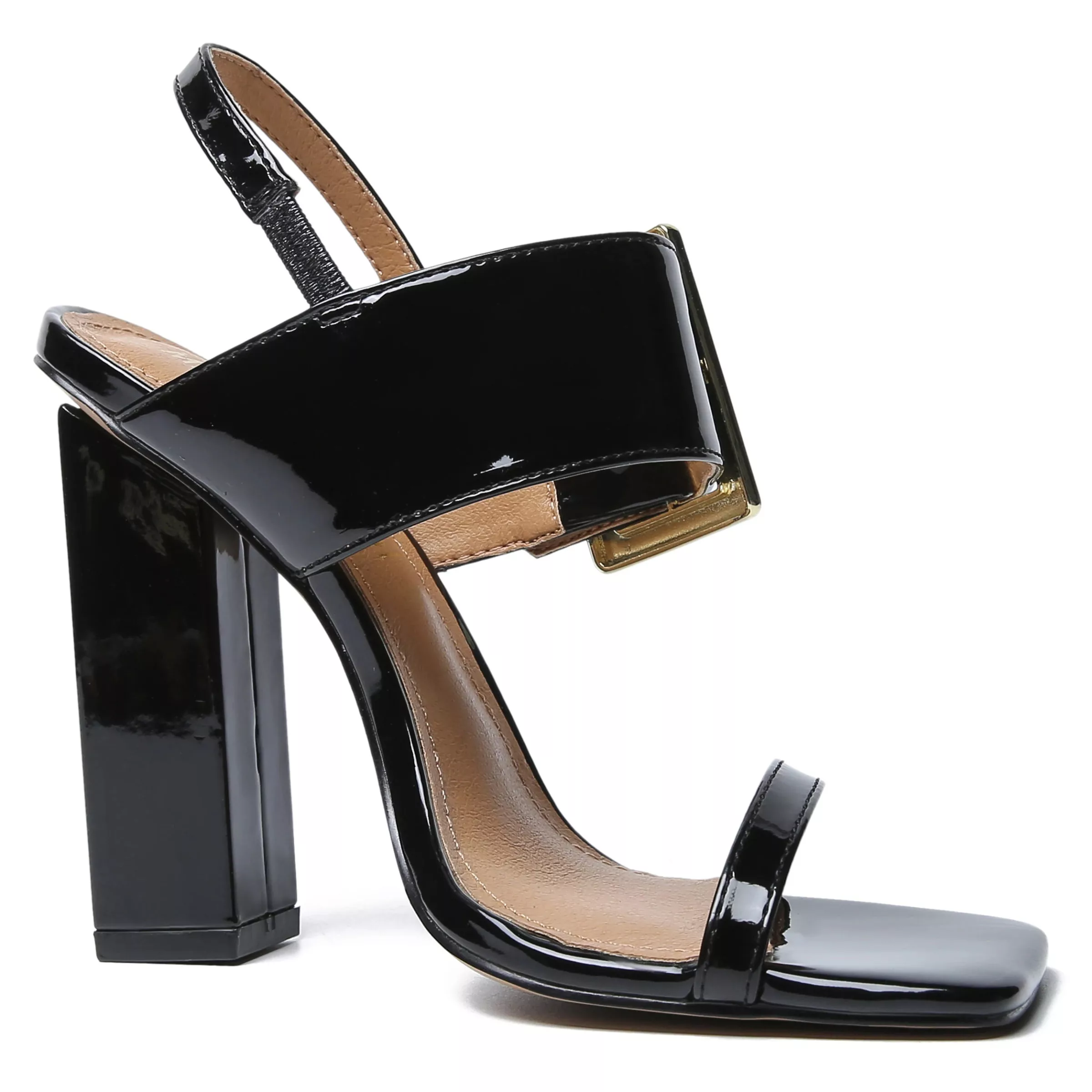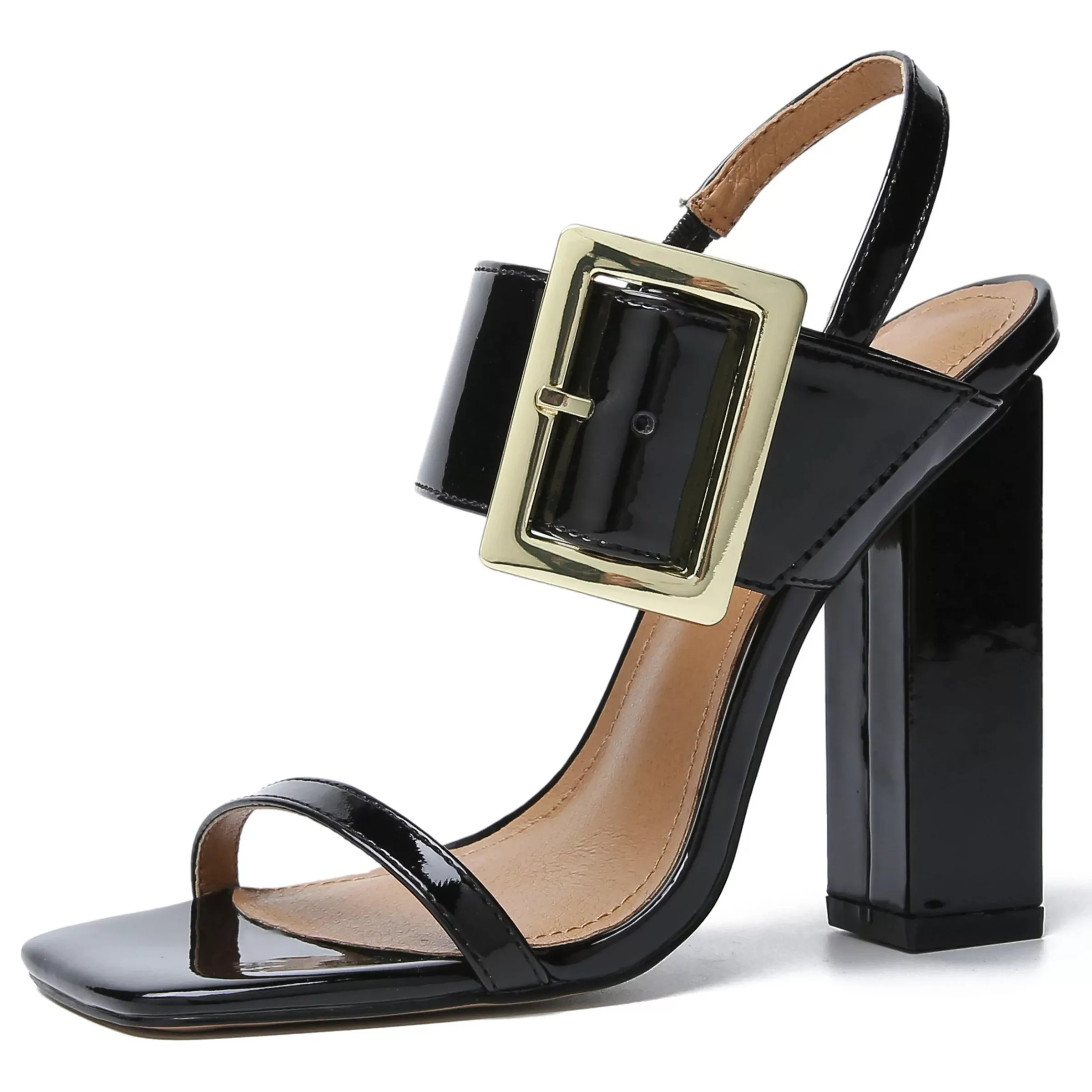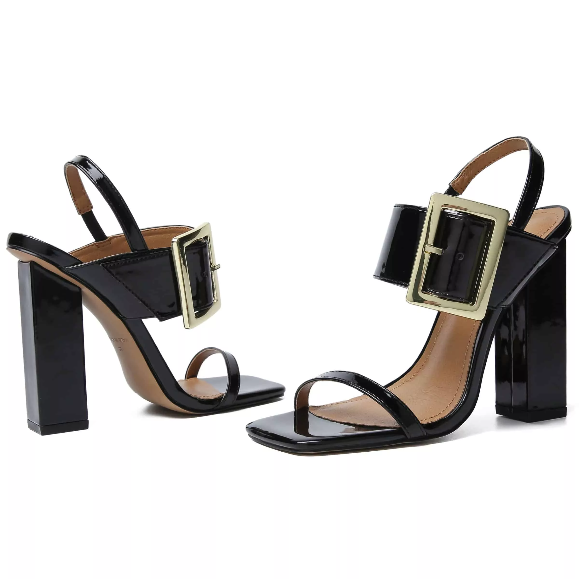 Striking high-gloss strappy sandals with a bold buckle, square toe, and block heel for modern elegance and comfort.