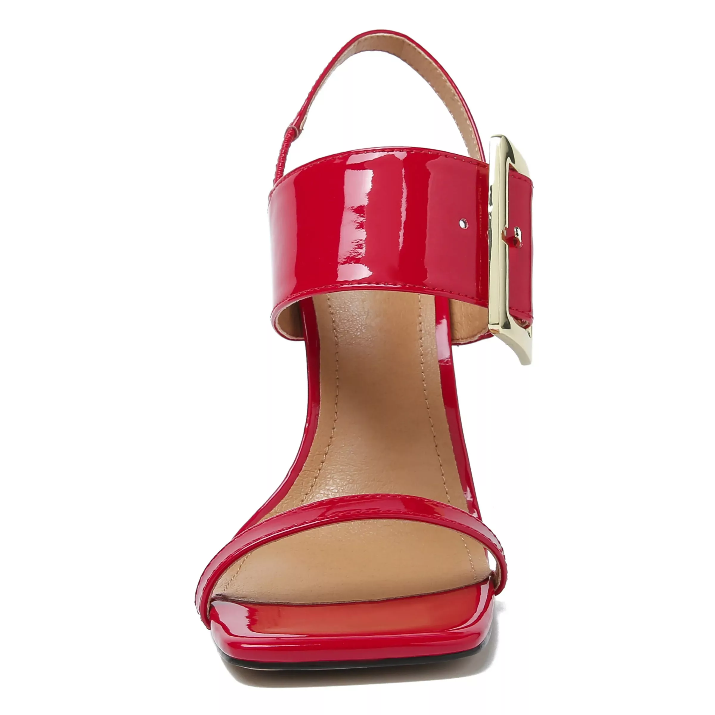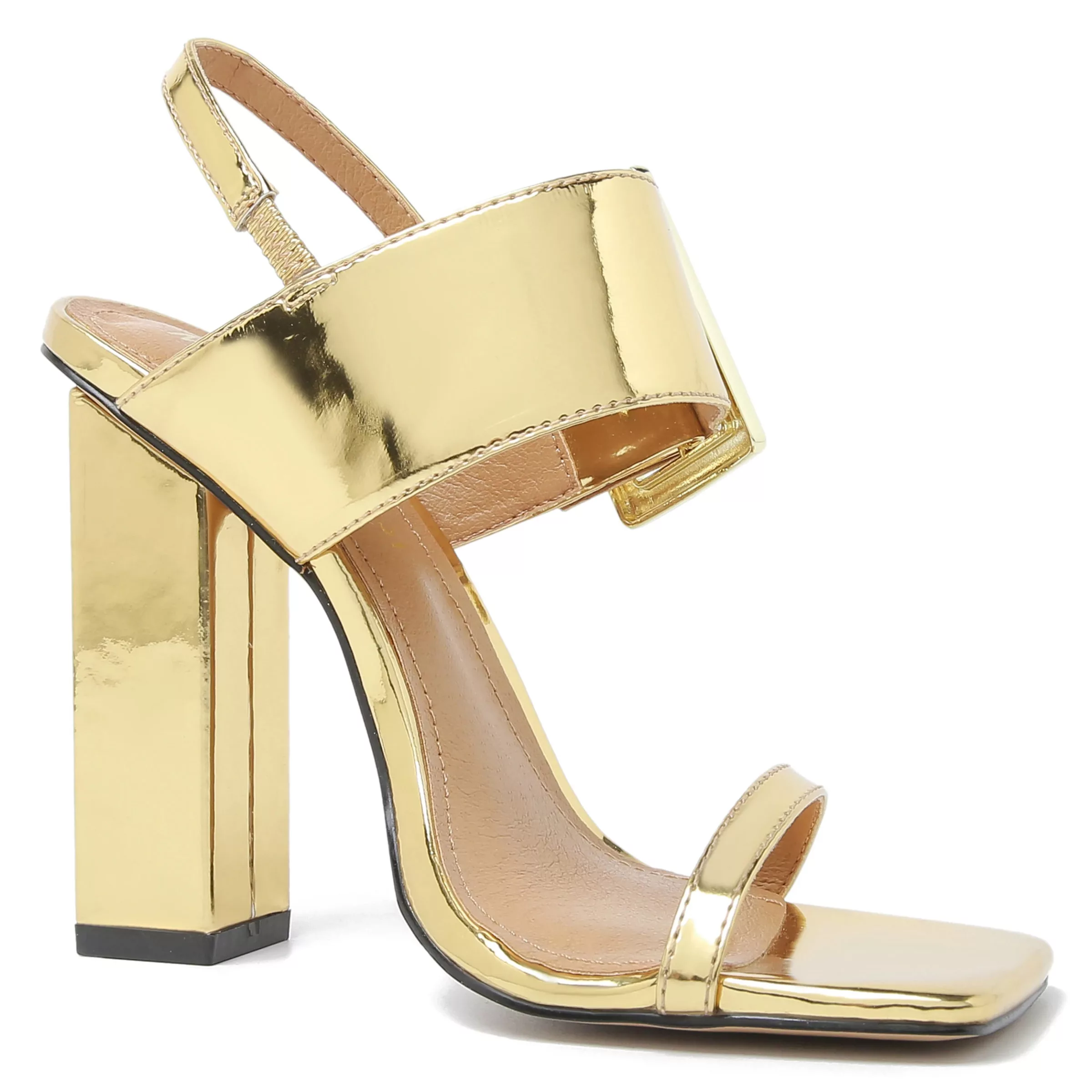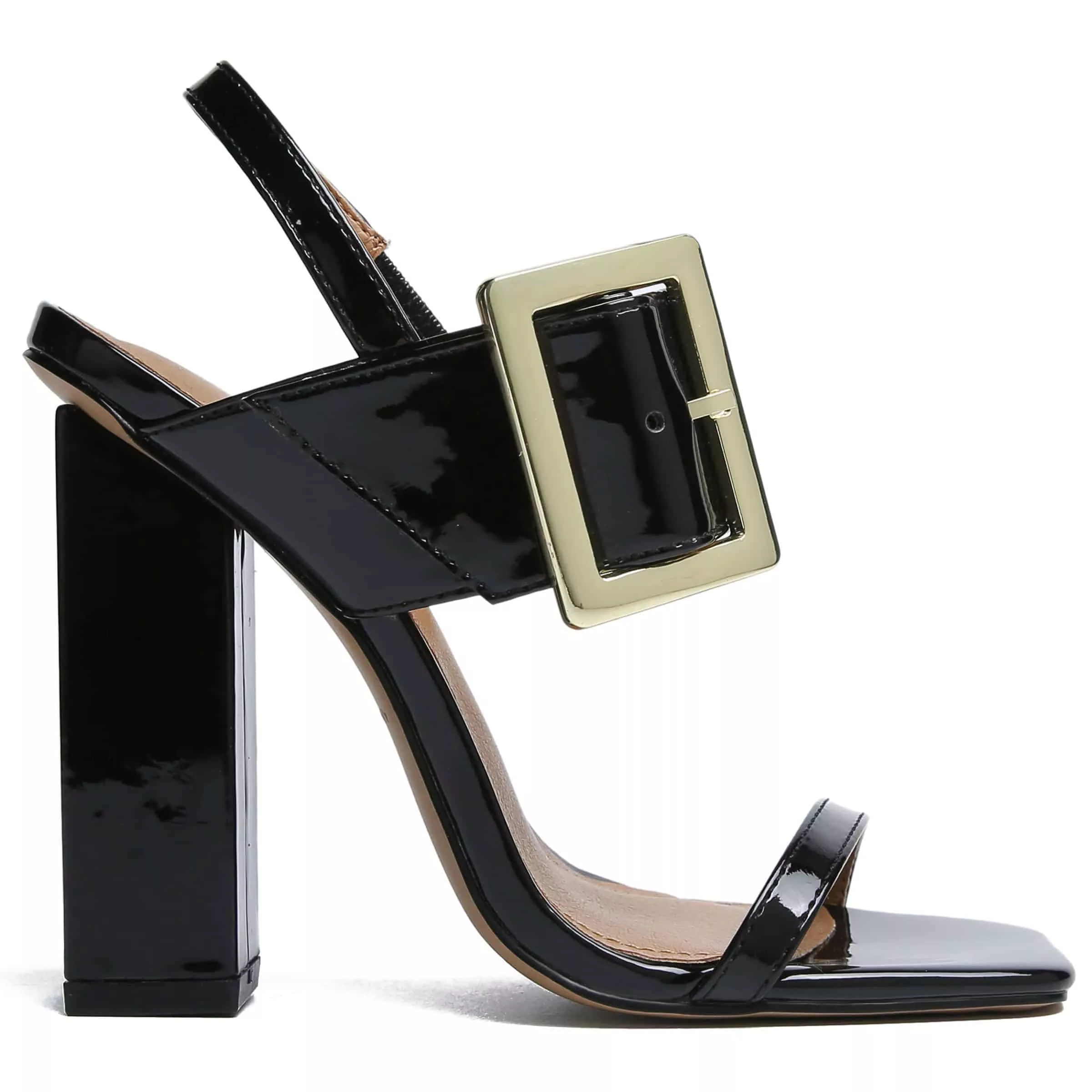 Striking high-gloss strappy sandals with a bold buckle, square toe, and block heel for modern elegance and comfort.