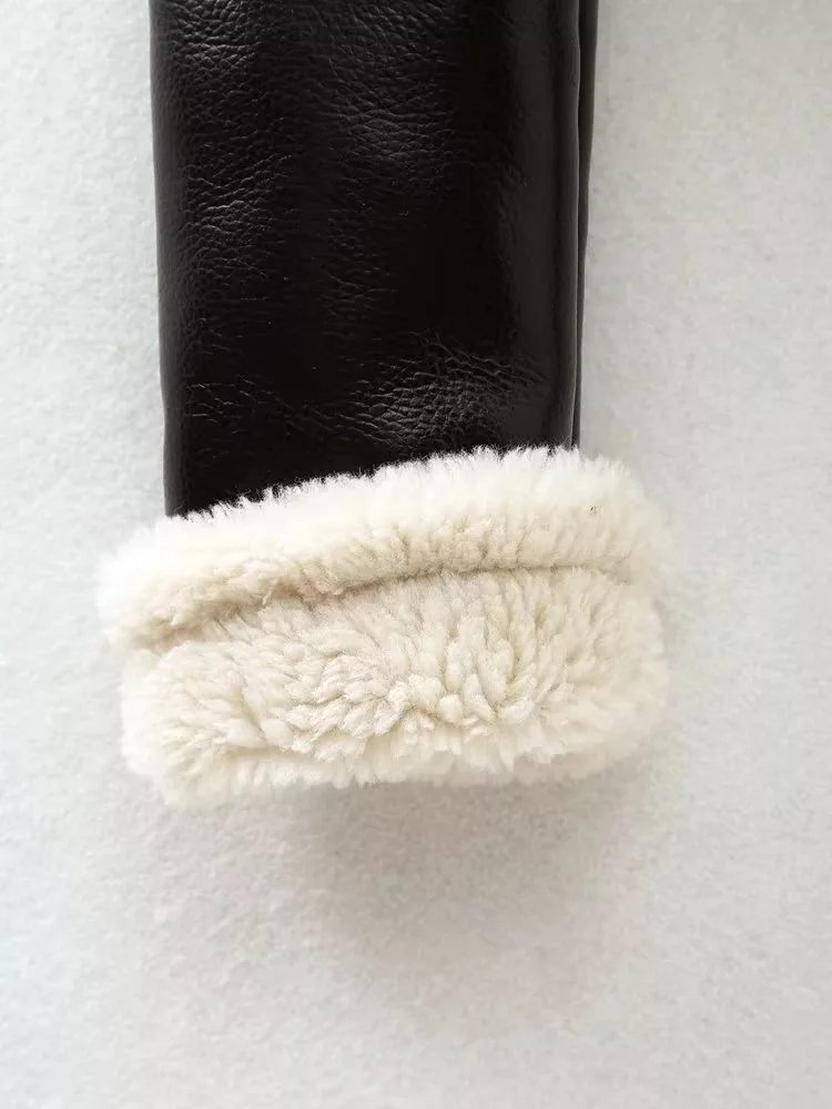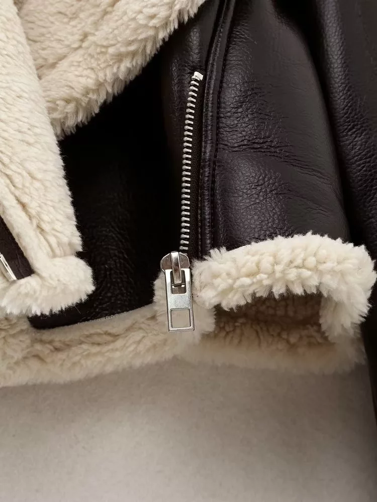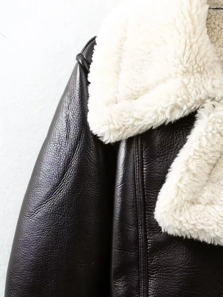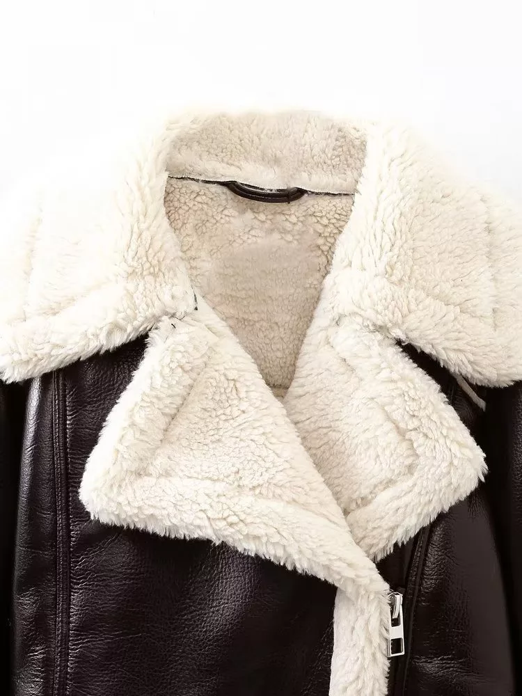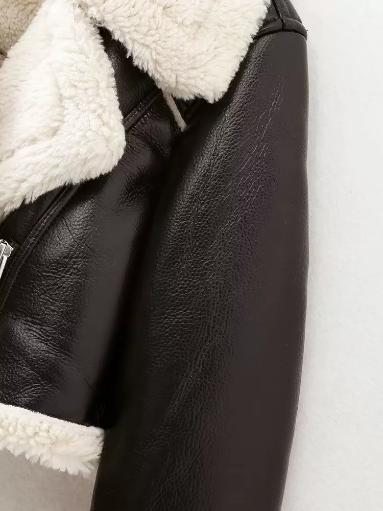 This borg-lined faux leather aviator jacket features a vintage lapel, front zipper, and cropped design for a stylish and cozy look.