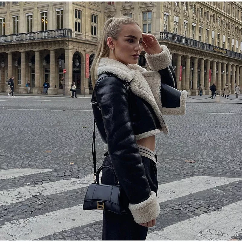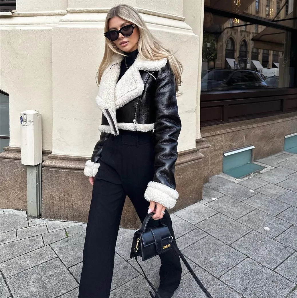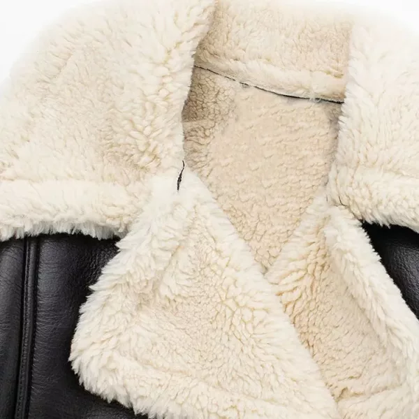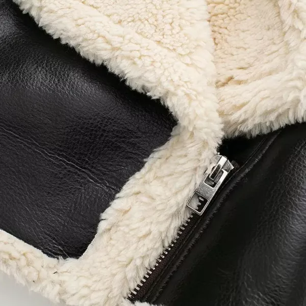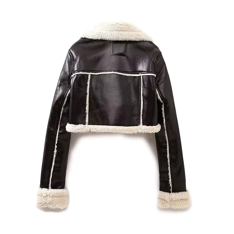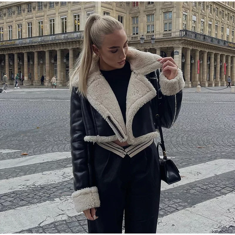 This borg-lined faux leather aviator jacket features a vintage lapel, front zipper, and cropped design for a stylish and cozy look.