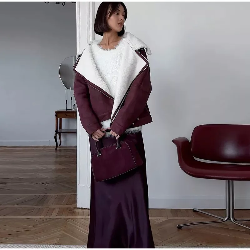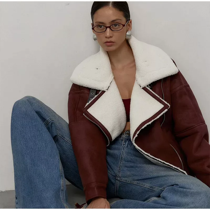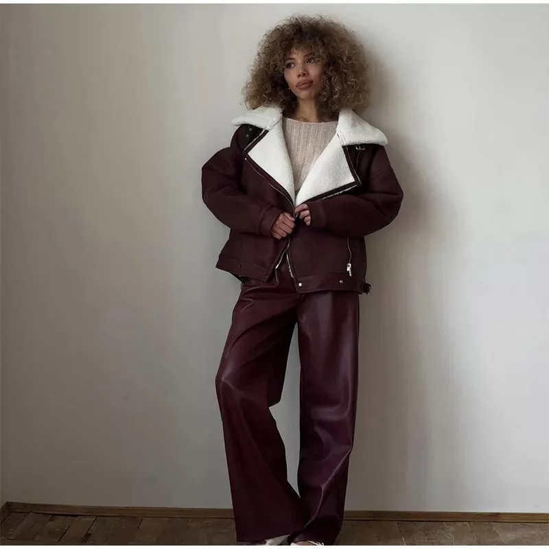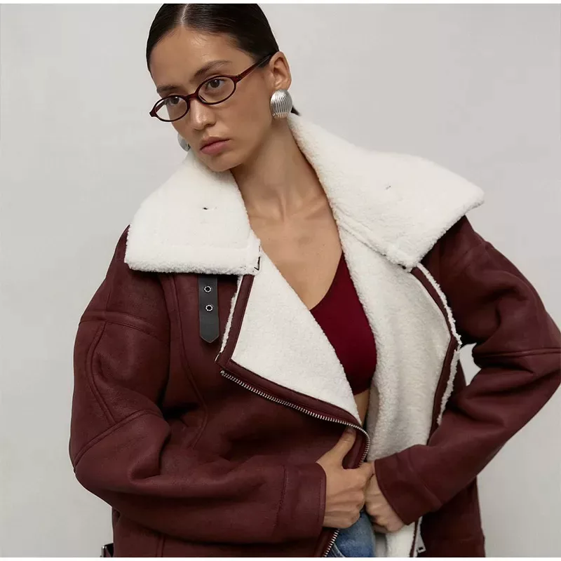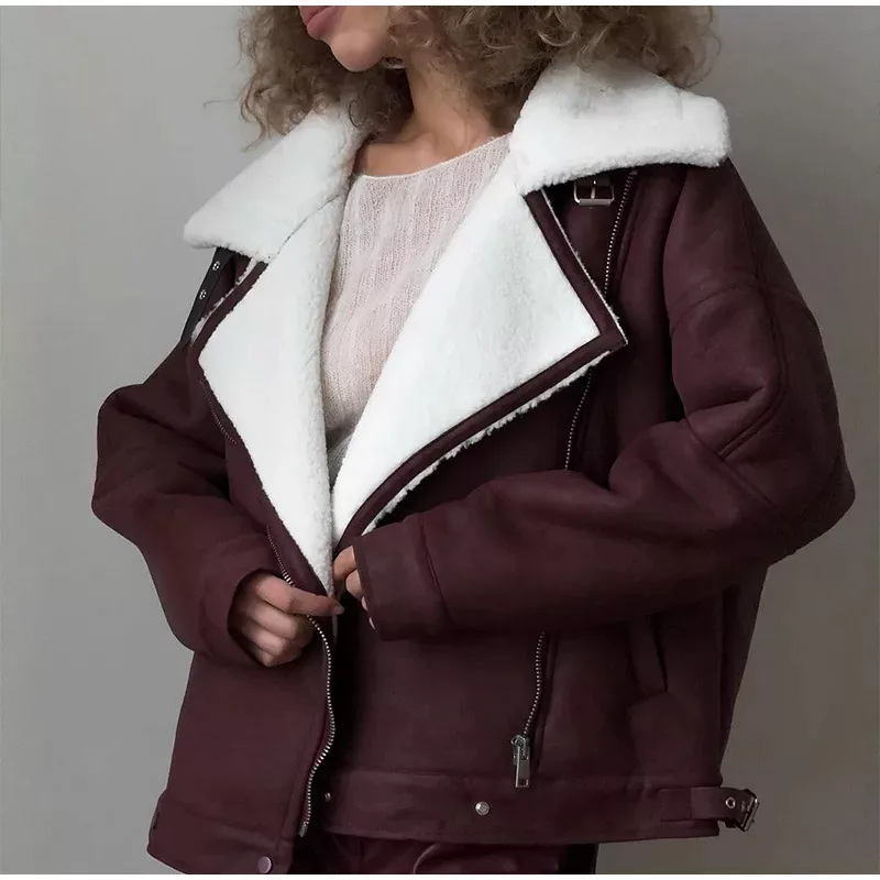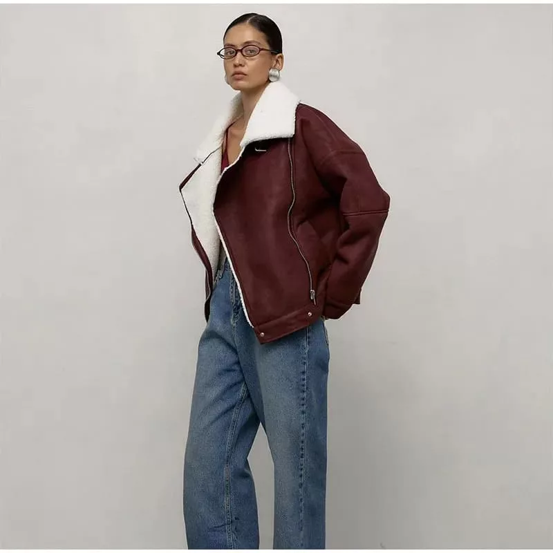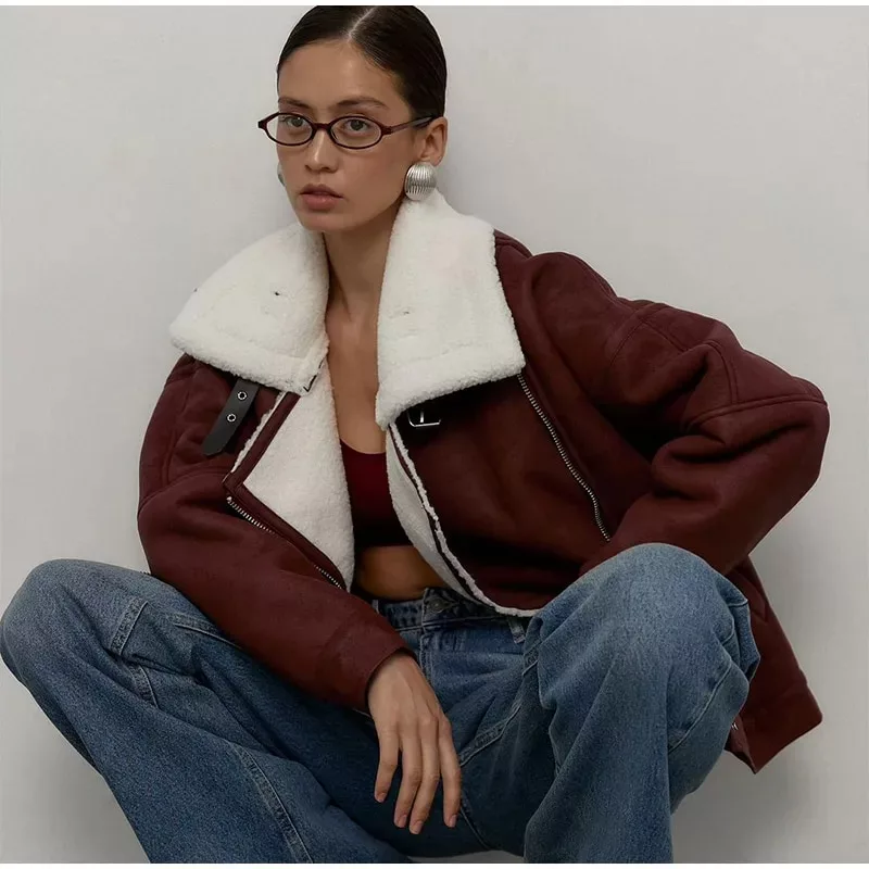 The faux leather finish provides durability and texture, while the vintage zipper details add an old-school charm. Its oversized lapel design creates a striking silhouette that draws attention while maintaining an effortless, laid-back vibe. This burgundy shearling jacket is the ultimate blend of luxury and functionality, designed for the woman who values both style and comfort.