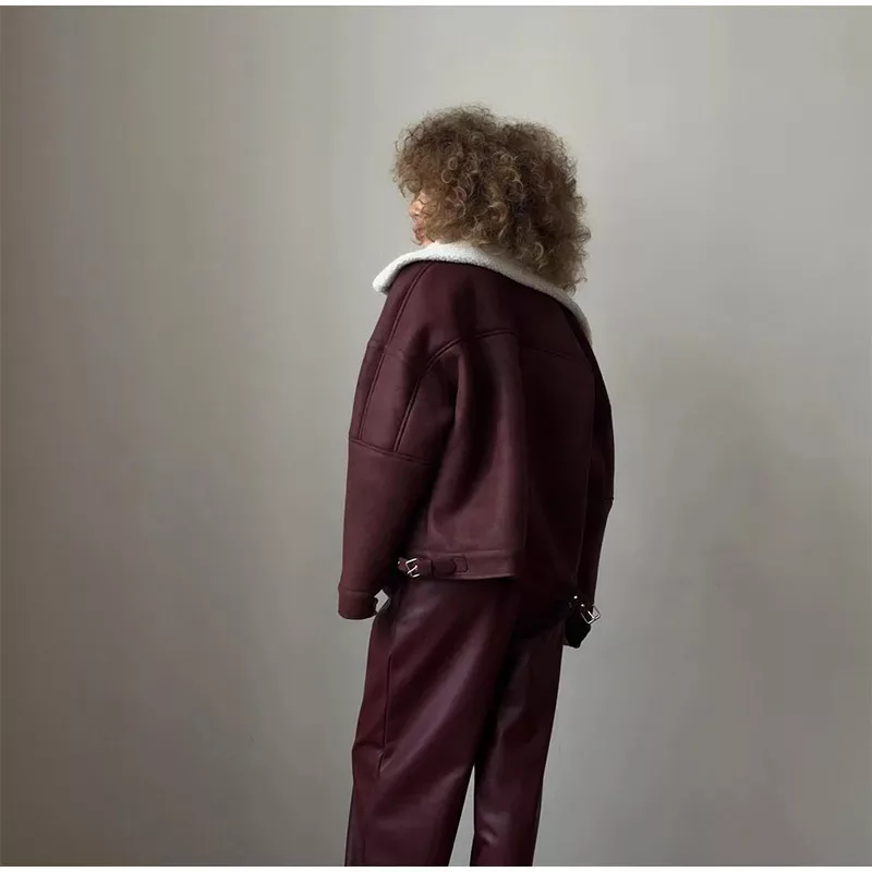 A stylish burgundy faux leather jacket with a white shearling collar, vintage zipper details, and a large lapel for a bold look.