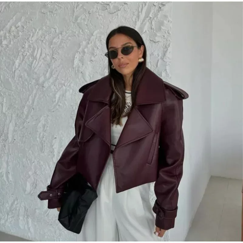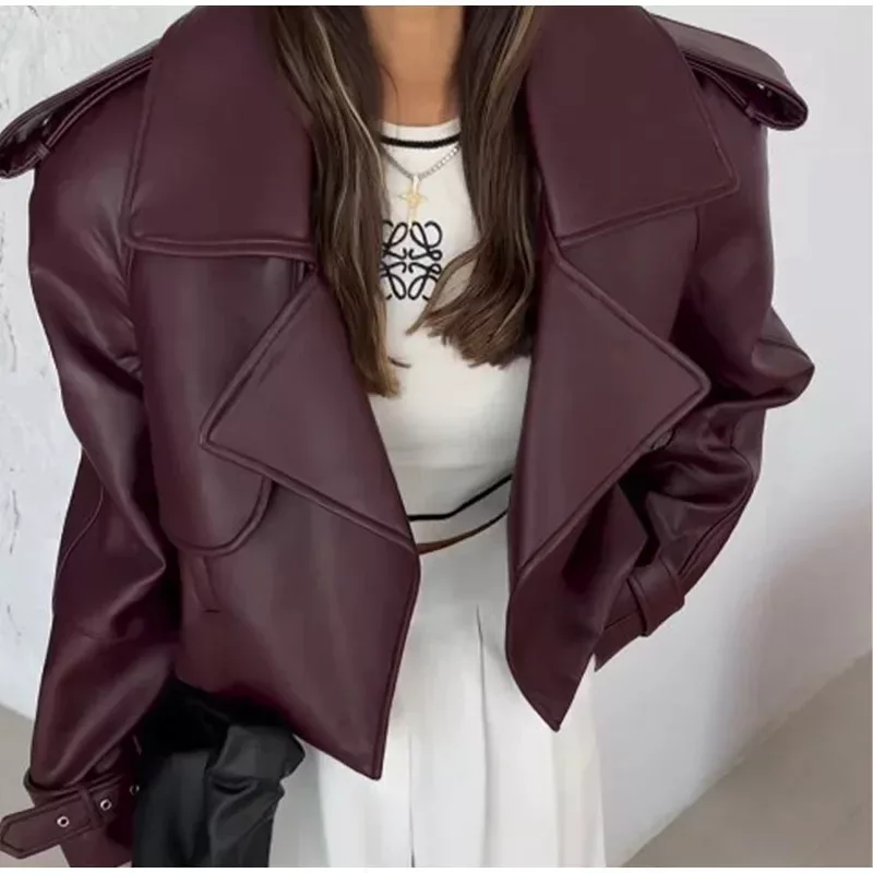 Perfect for transitional seasons, this jacket effortlessly pairs with a wide range of outfits—from chic dresses to casual jeans. The deep pockets not only enhance its practicality but also add to the laid-back, modern vibe. Whether you’re navigating the city streets or enjoying a relaxed weekend getaway, this oversize Leather Jacket brings an air of sophistication to your everyday wear. The Burgundy Lapel Leather Jacket truly encapsulates the essence of understated luxury.