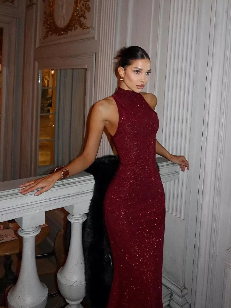 The intrinsic artistry of this gown is manifested in its captivating details. The high halter neckline offers a contemporary and elegant frame for the décolletage, providing a sophisticated alternative to traditional necklines. The entirety of the dress is meticulously embellished with shimmering burgundy sequins, designed to catch and reflect light with every subtle motion, thereby ensuring the wearer remains the focal point of any gathering. The form-fitting silhouette gracefully extends through the body, flaring dramatically from the knee into a distinctive fishtail, culminating in a subtle train that enhances its dramatic appeal. This harmonious integration of a modern cut with classic embellishment creates a dynamic visual impact that is both timeless and strikingly current.