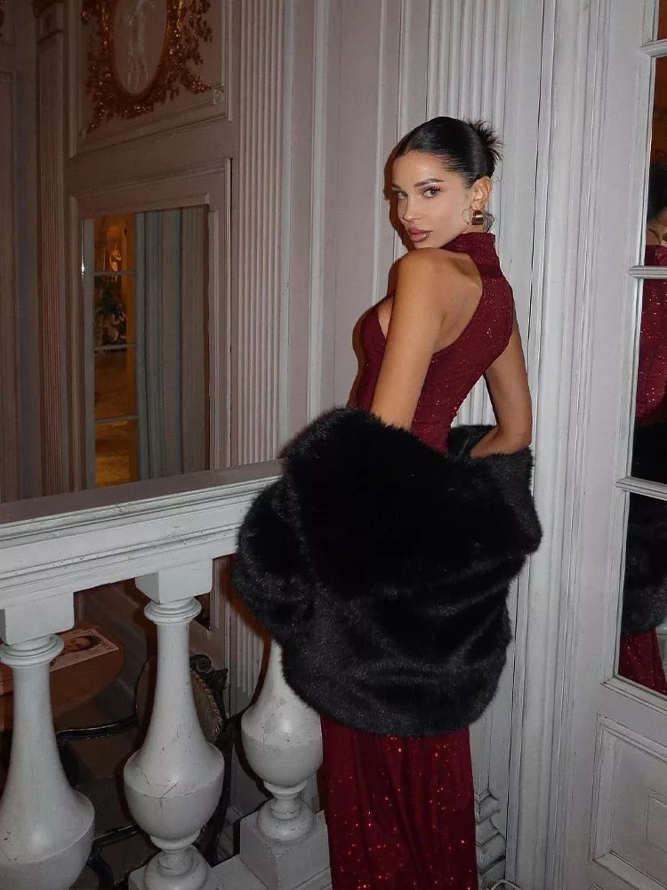 Envision yourself gracing an opulent event, every movement punctuated by a captivating shimmer. The Burgundy Sequin Halter Fishtail Gown is engineered for such moments, meticulously crafted to sculpt and enhance the silhouette. This floor-length gown, adorned with exquisite sequin embellishment, drapes flawlessly, creating a sleek, elongated form that flows into a dramatic fishtail flare, exuding confidence and grace. It represents more than a mere garment; it embodies a profound sense of allure, ensuring a feeling of poise and power from the instant it is worn.