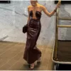 Confidence has a texture, and this dress knows it. Crafted from high-gloss vinyl, it reflects light like liquid, catching attention with every step. The structure is intentional: a strapless, sculpted bodice with a deep plunge neckline, engineered to frame the chest and collarbones with modern precision. The fit follows the body closely through the waist and hips before extending into a floor-length column skirt, creating that long, fluid line seen on runways and red carpets.
