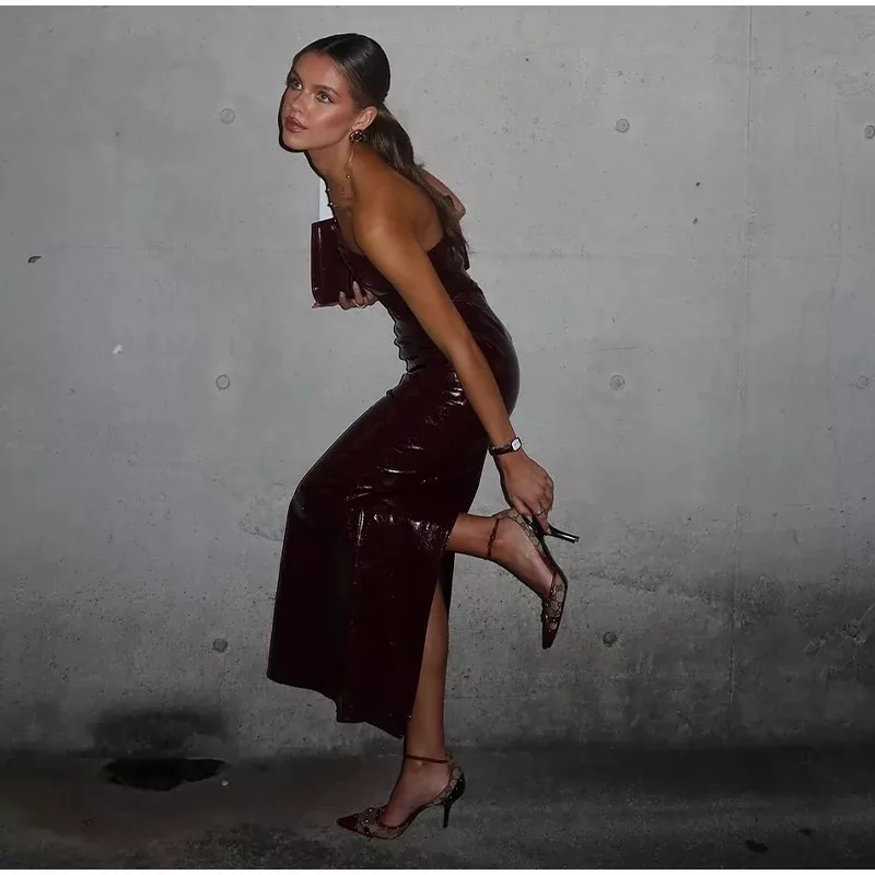 A glossy burgundy vinyl strapless maxi dress with a sharp plunge neckline and body-hugging silhouette. Bold, sculpted, and confident, it captures every reflection and commands every room.