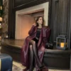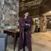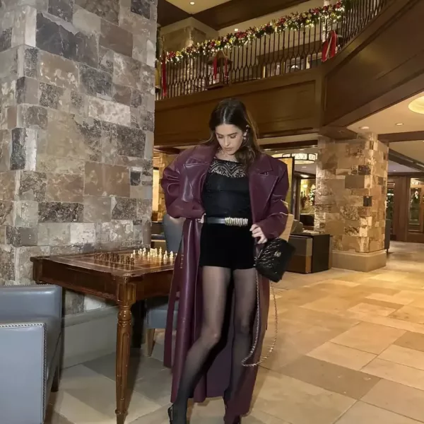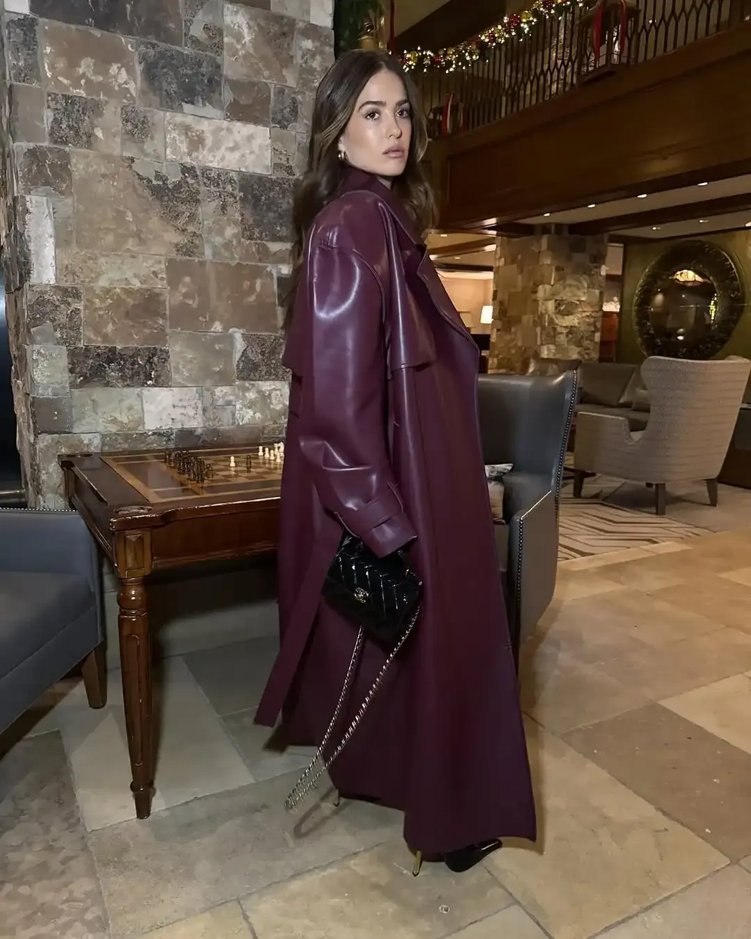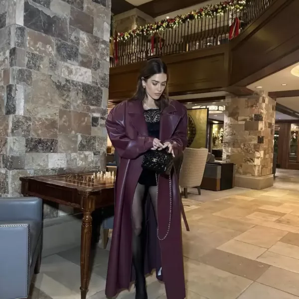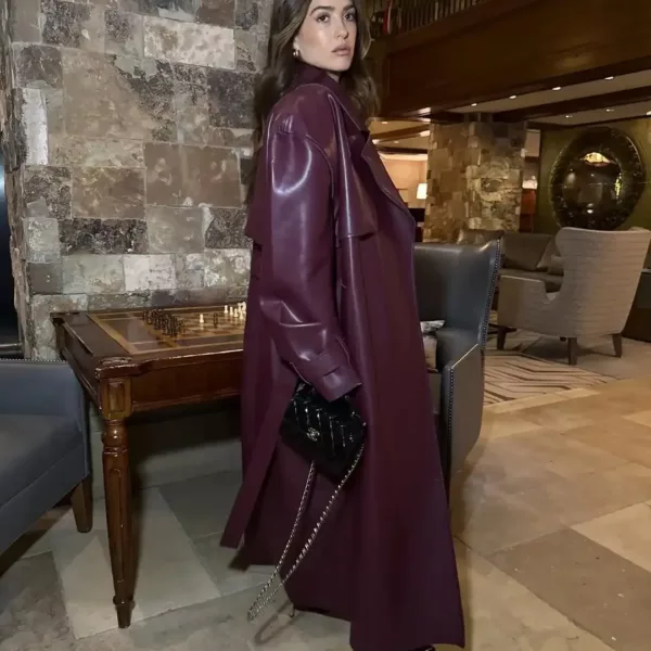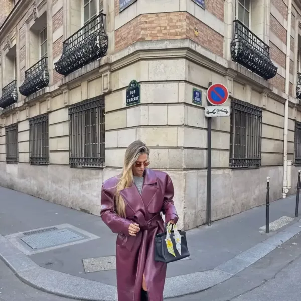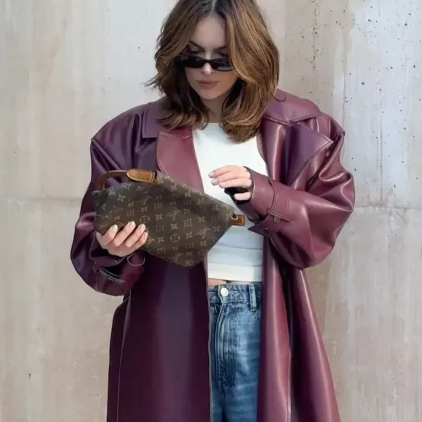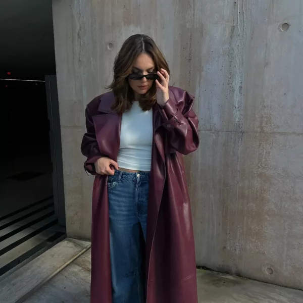 You don’t need to be louder to be seen just clearer. This Burgundy Vinyle Belted Trench is clarity tailored: long and lean, with sculpted shoulders, sharp lapels, and a belt that turns volume into intention. The surface catches city light like wet paint; the movement is fluid, never fussy.