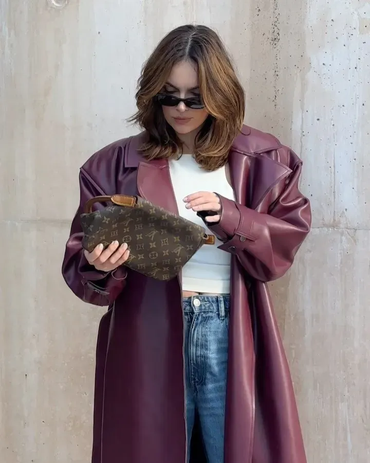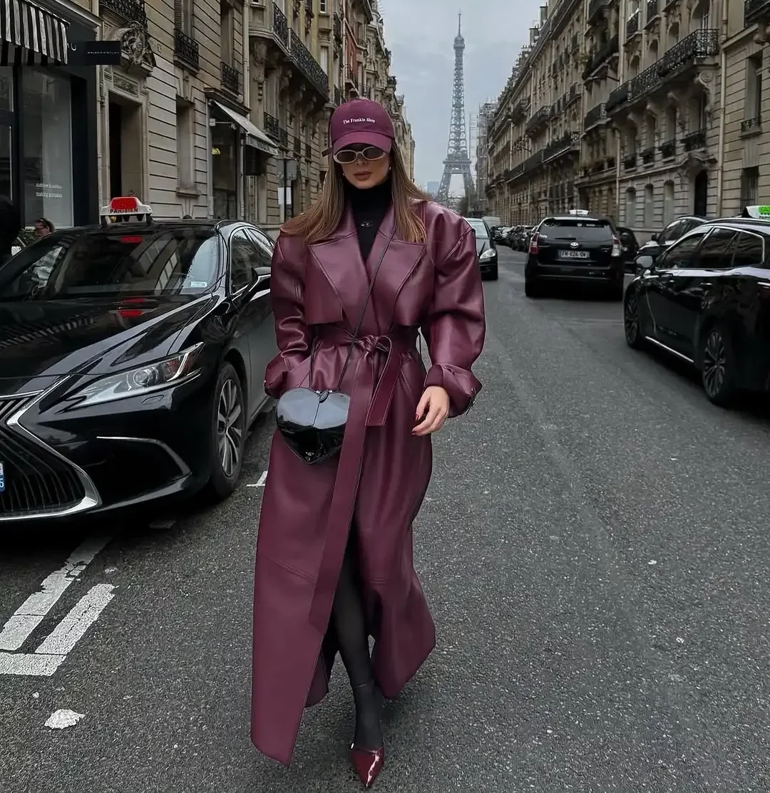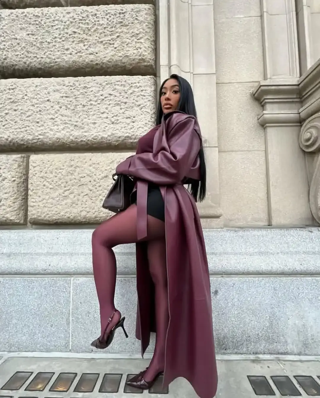 Lacquered burgundy trench with architectural shoulders and layered storm flap; belted to sculpt. Mirror-gloss finish, fluid stride. Soft Power made wearable from morning meetings to midnight plans.