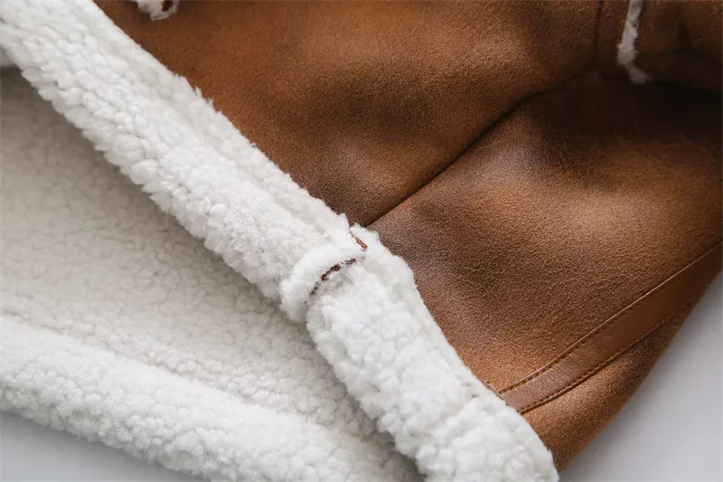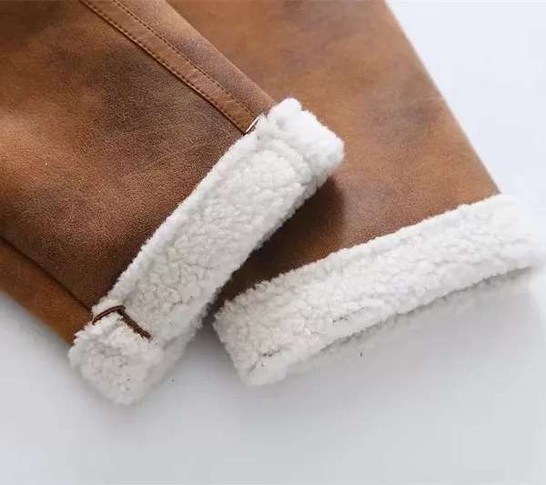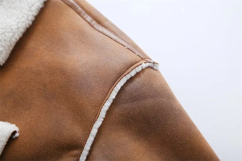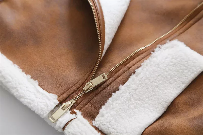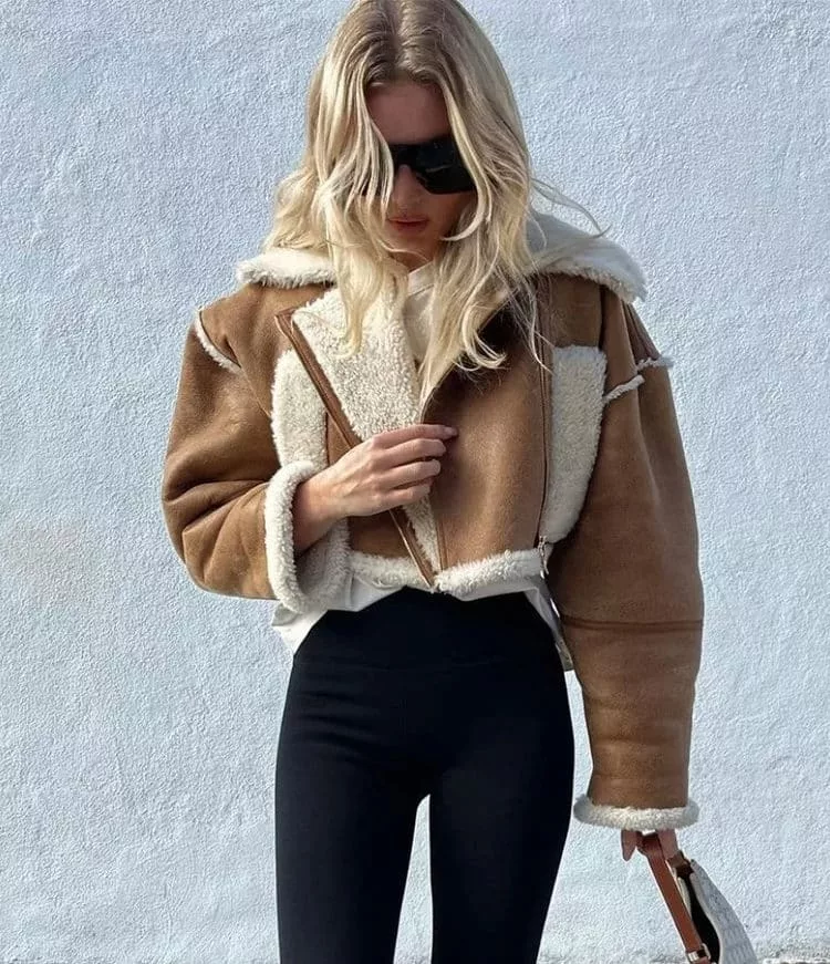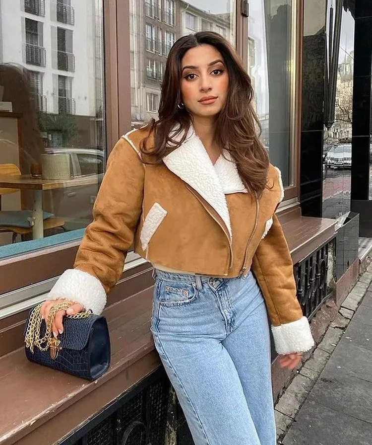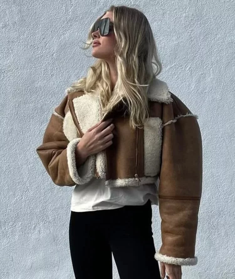 The Cropped Faux Leather Aviator Jacket with Shearling Lining delivers both warmth and contemporary style, making it an ideal addition to any winter wardrobe. Crafted from rich brown faux leather, this jacket is lined with a plush cream faux shearling that not only provides superior insulation but also adds a luxe feel to its aesthetic. Designed with an oversized collar and bold lapels, it presents a refined yet edgy silhouette that stands out in any high-street or casual setting.