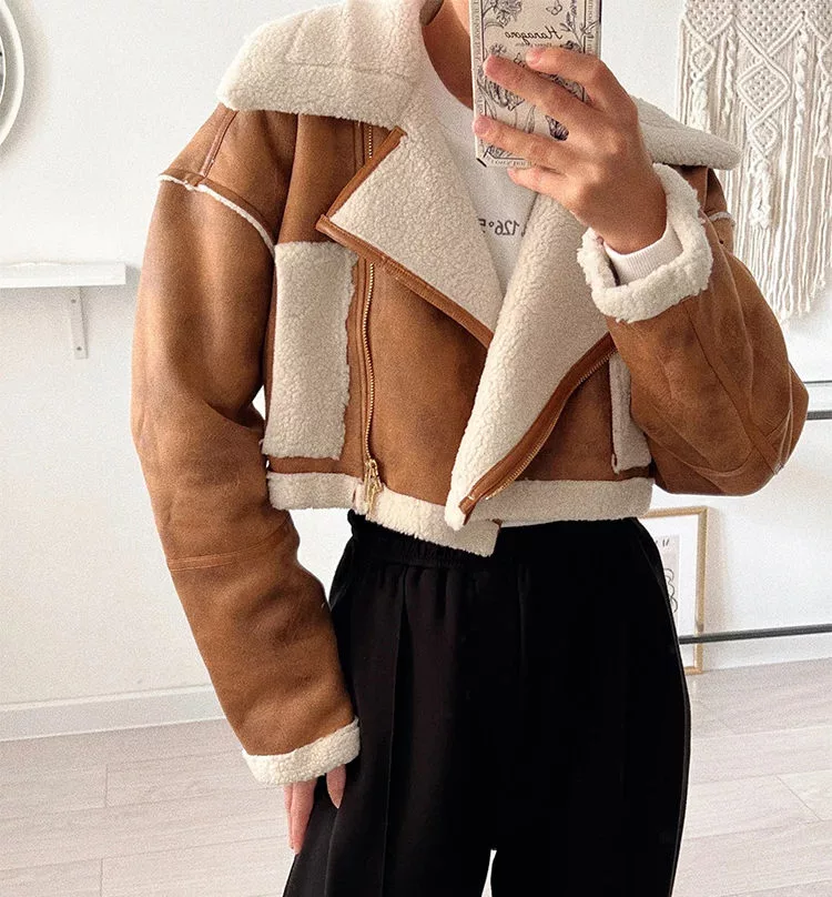 Blending vintage allure with modern high-street fashion, this Cropped Faux Leather Aviator Jacket is perfect for adding warmth and style to any outfit, from casual to chic.
