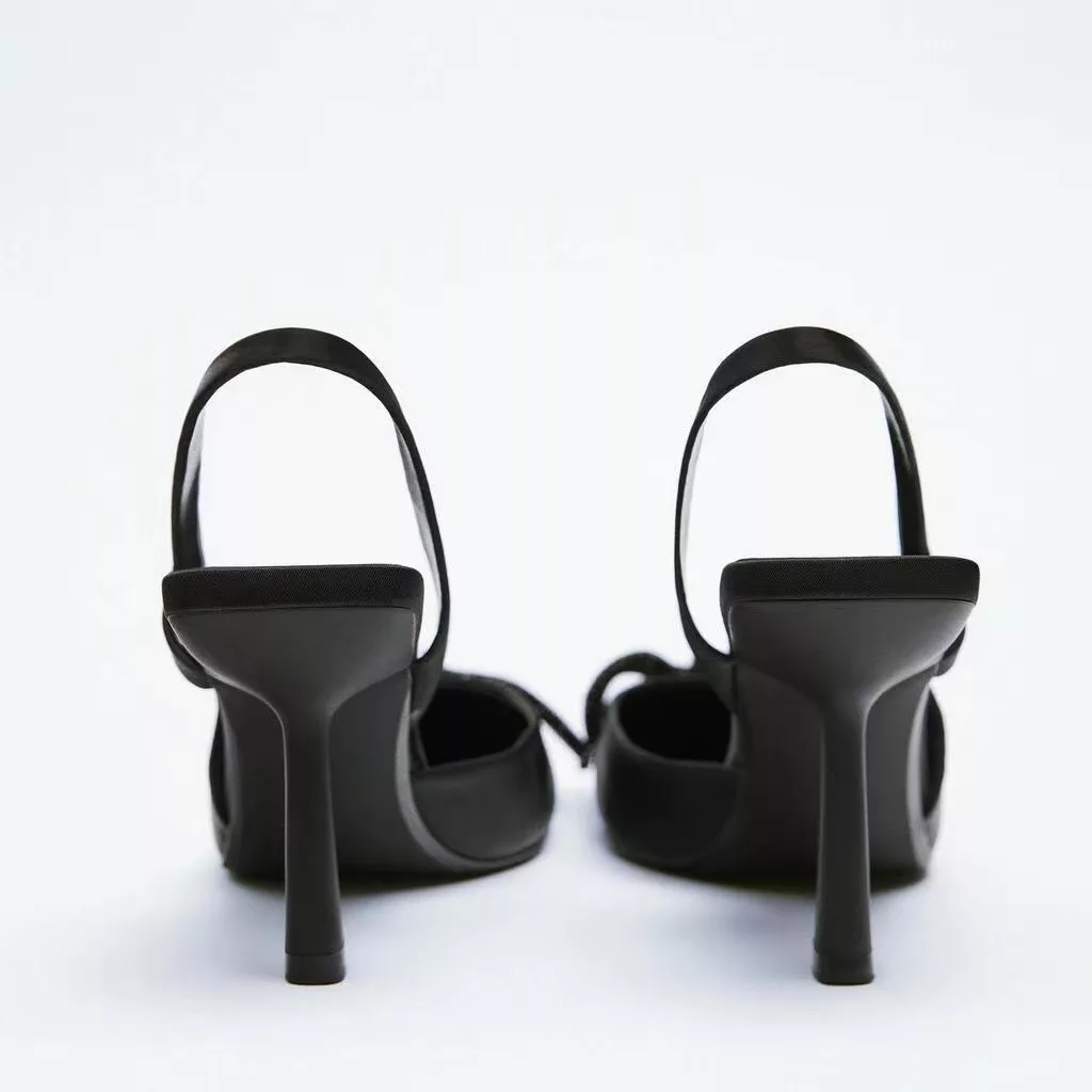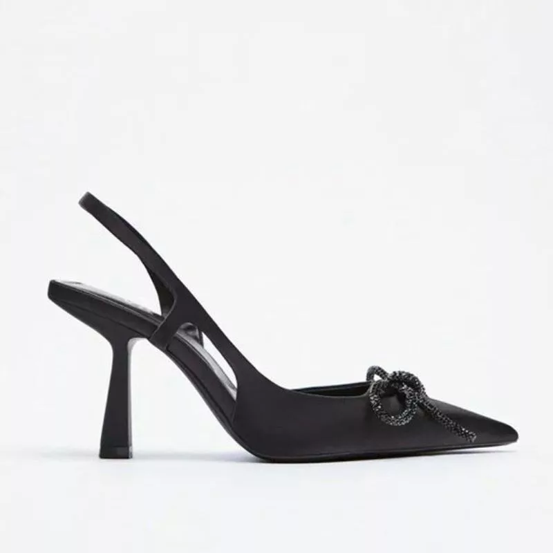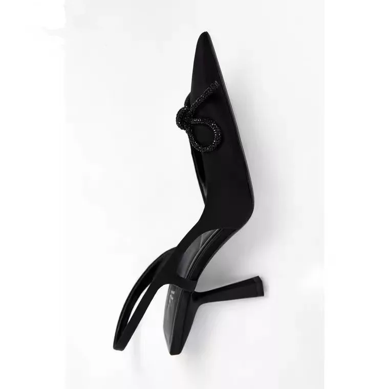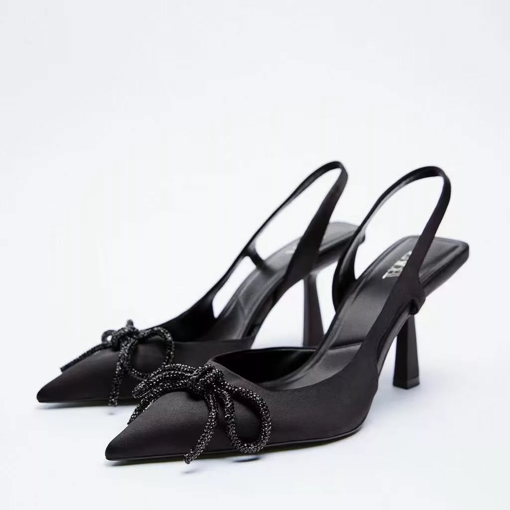 Elevate your style with the Crystal-Bow Slingback Pumps, an exquisite pair of heels that seamlessly blend sophistication and grace. These sleek black mid-heel pumps are perfect for adding a touch of elegance to any ensemble. The standout feature is the crystal-embellished bow, which adds a charming yet luxurious detail, making these shoes ideal for both special occasions and upscale everyday outfits.