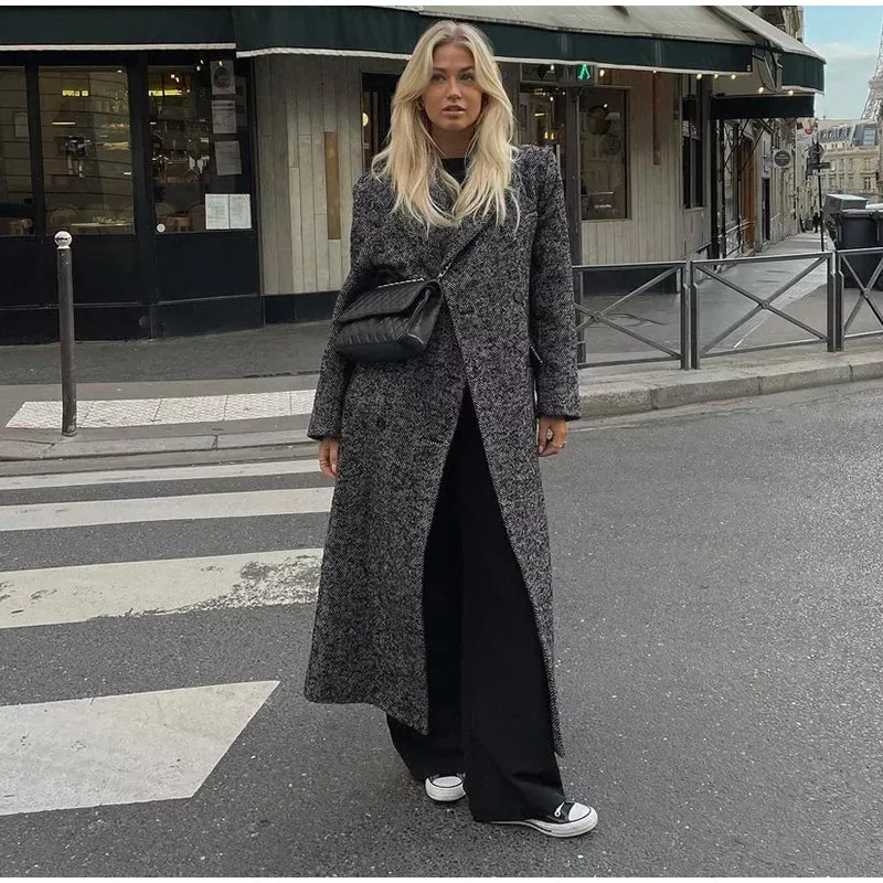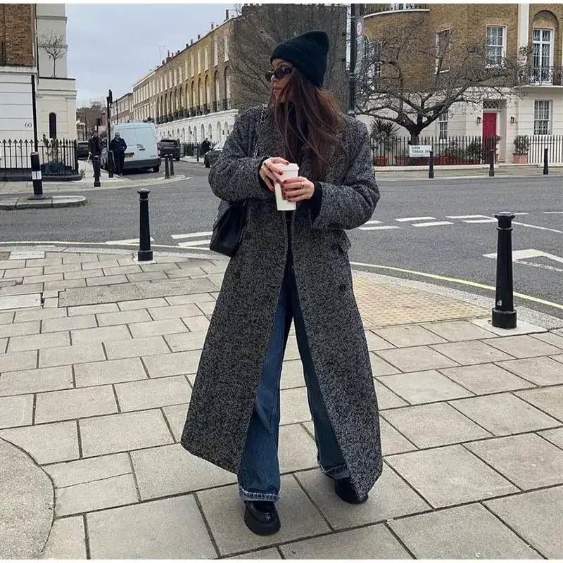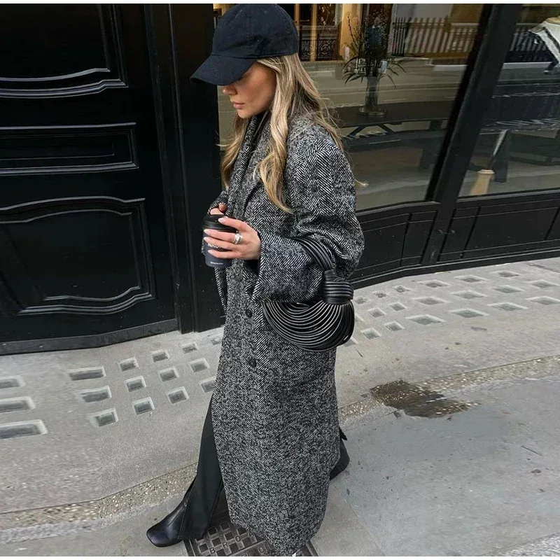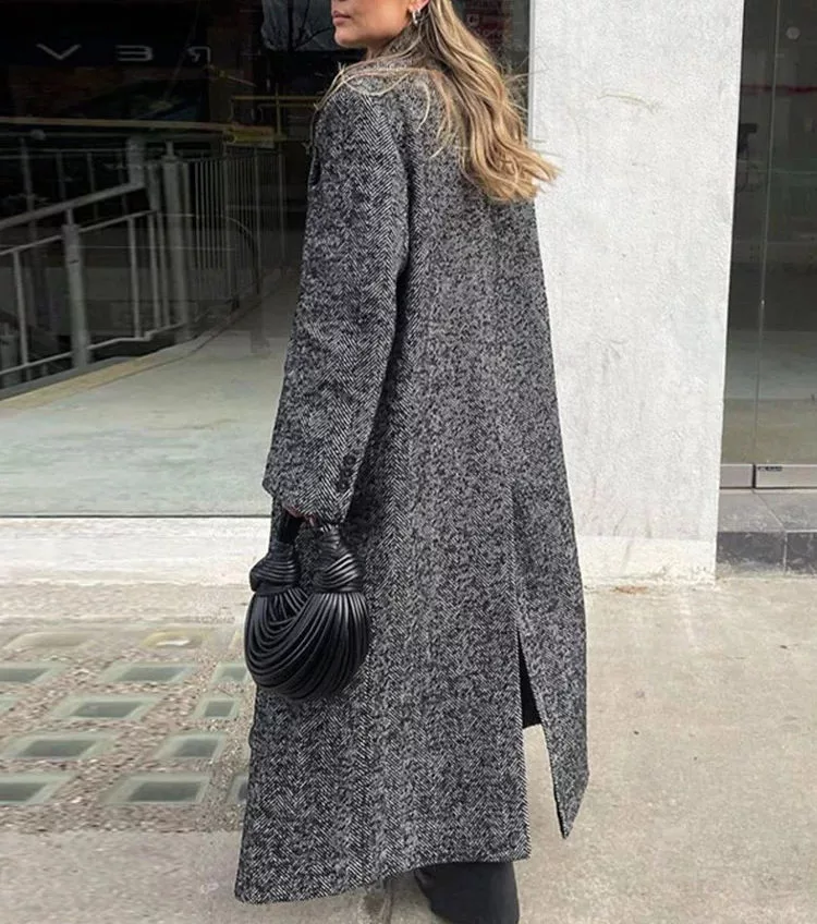 For a clean finish, the coat features hidden buttons on the front. The subtle front slit pockets at hip level add both style and functionality. Full-length sleeves, slightly oversized, contribute to a relaxed yet polished look, making this coat versatile for different outfits.