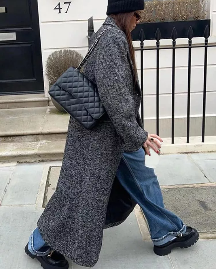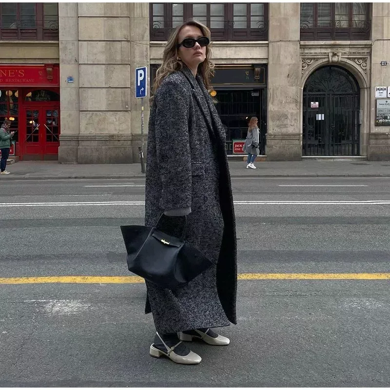 This dark gray coat’s full-length design, falling around calf-length, creates a dramatic yet practical silhouette. Its relaxed, tailored fit allows comfortable layering without losing its structured appeal. Wide, notched lapels add a formal touch, enhancing the coat’s sharp and sophisticated appearance.
