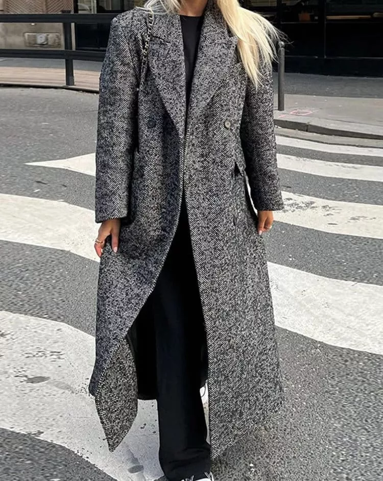 Whether paired with jeans and boots for a casual look or layered over a suit for more formal attire, this overcoat embodies elegance in every detail. Its herringbone weave and deep gray shade make it a wardrobe staple that suits various occasions.