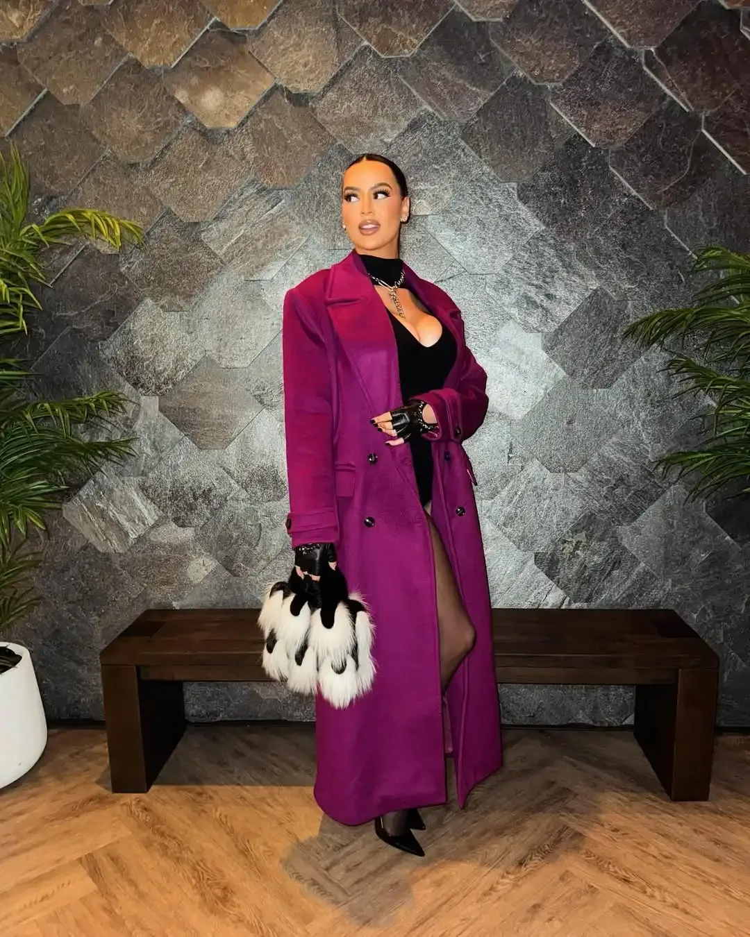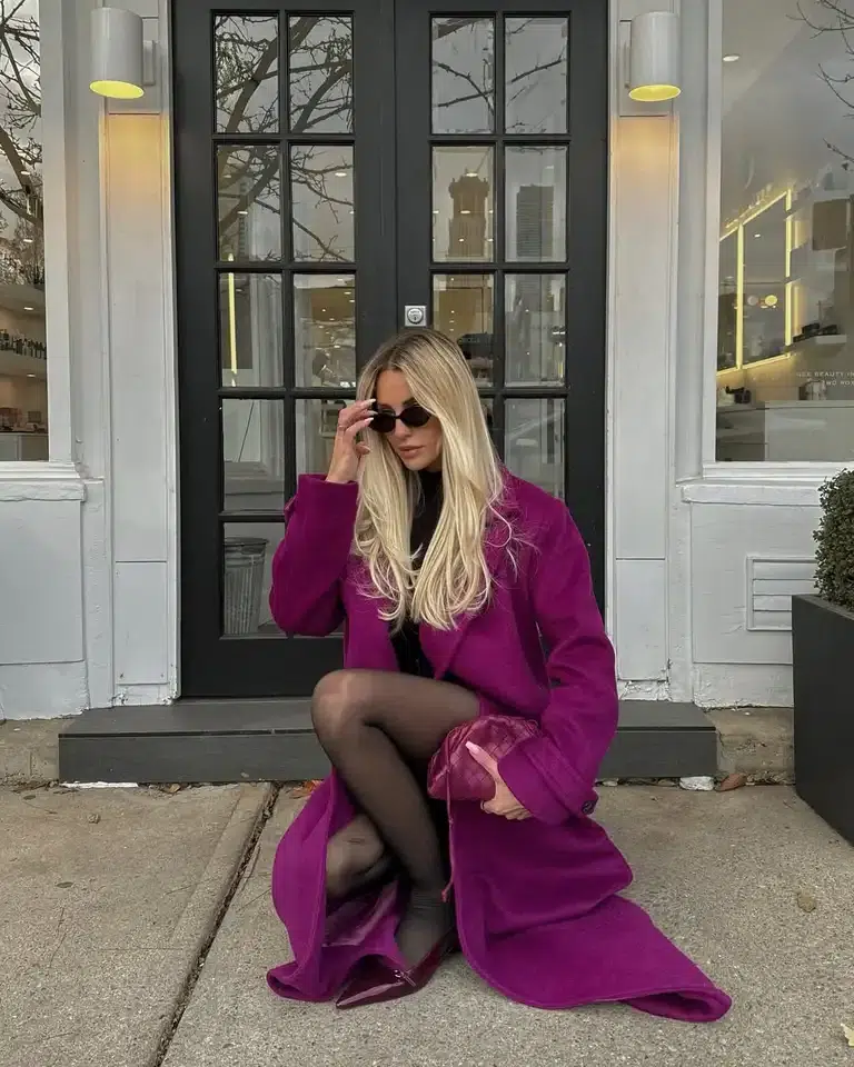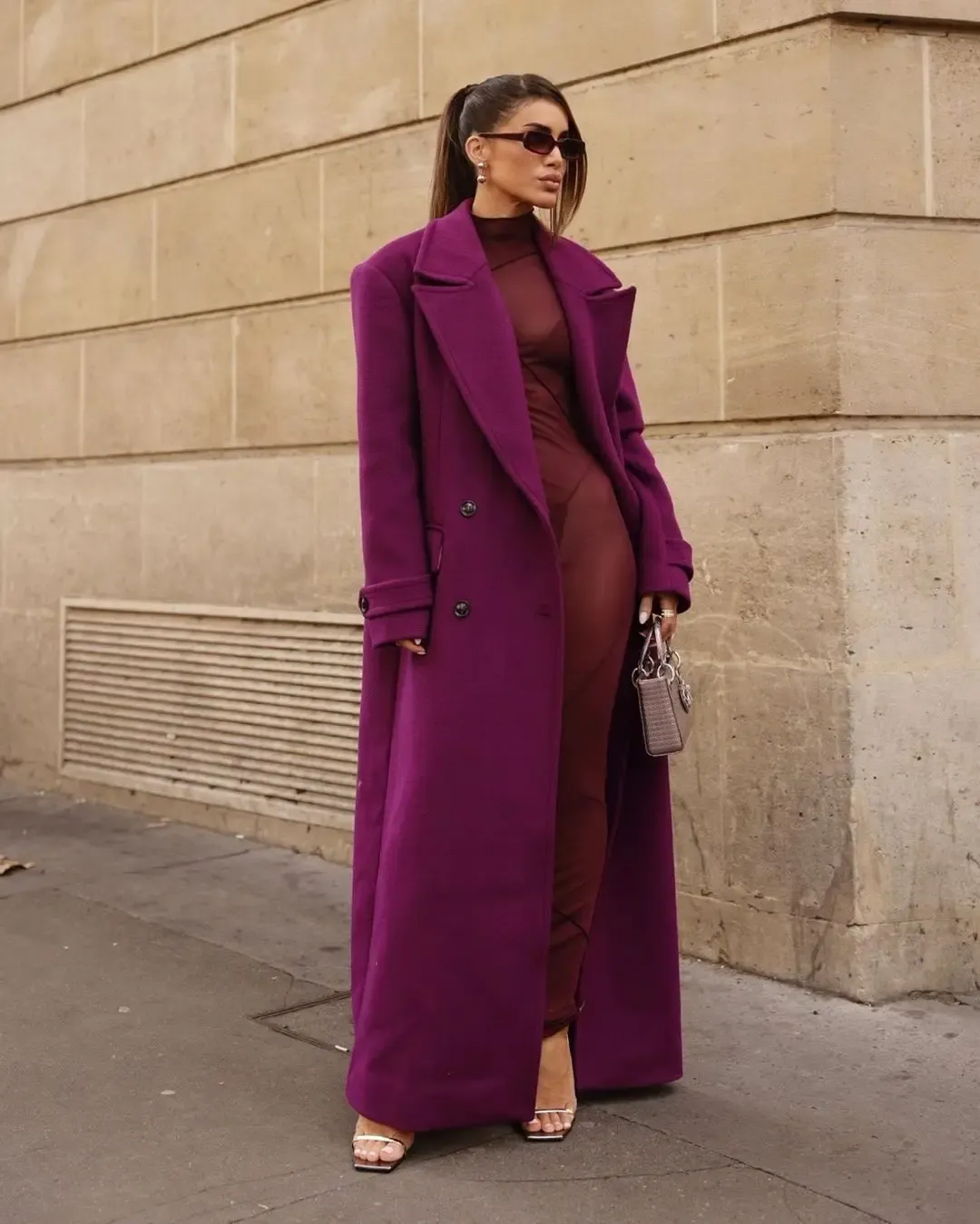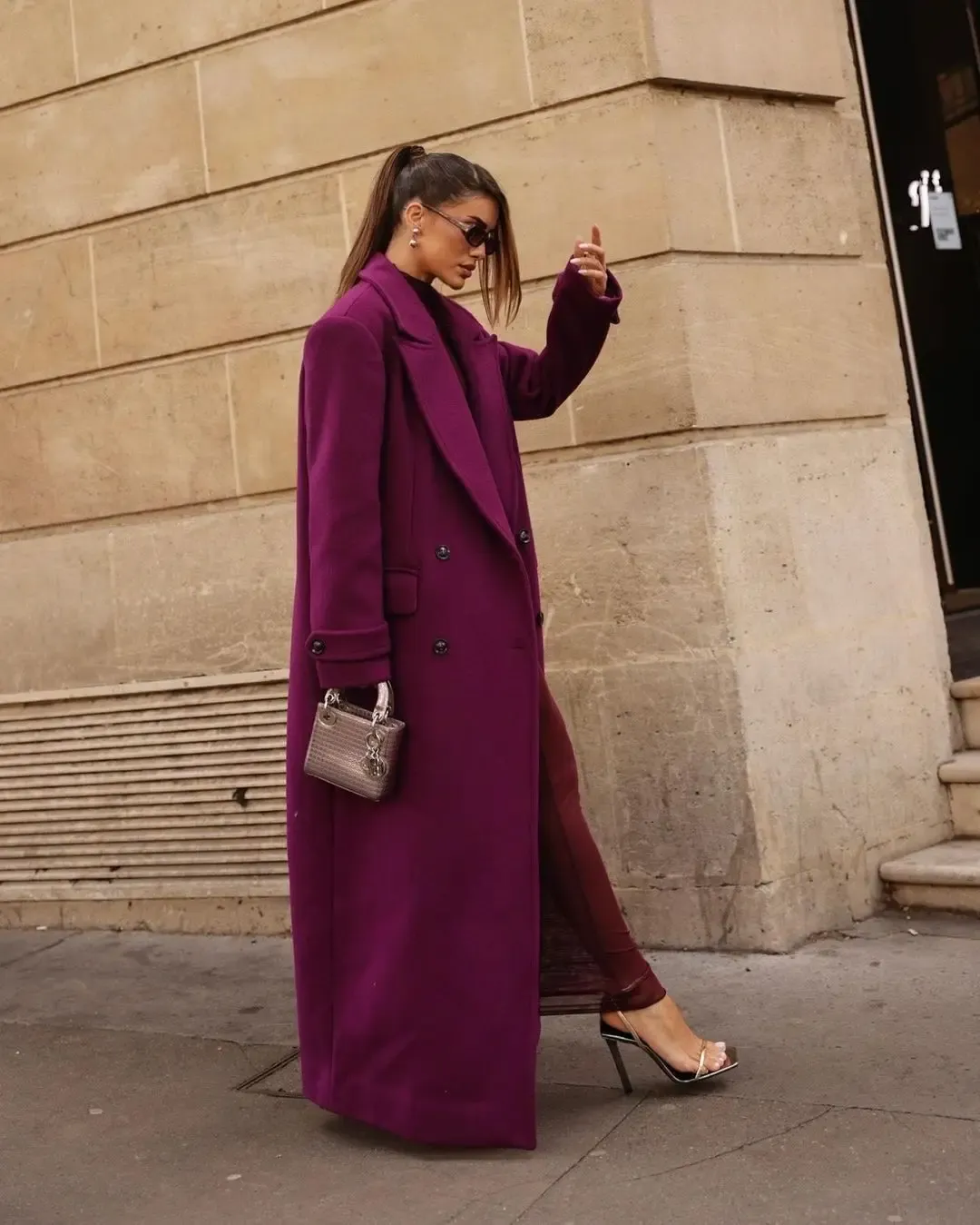Full-length, double-breasted tailoring in the season’s richest Deep Purple; clean lines, quiet drama, and effortless polish that elevates denim, suits, and slip dresses from morning meetings to midnight plans.