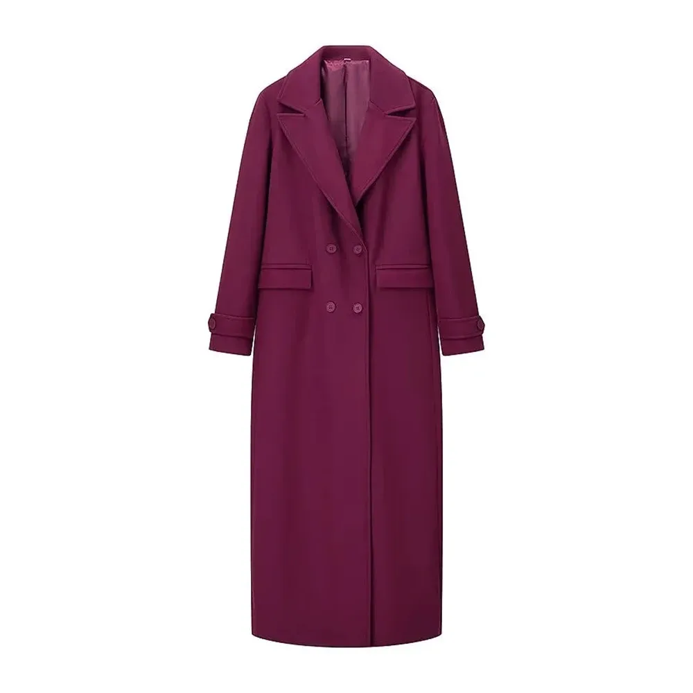 Meet the Deep Purple double breasted long coat that turns sidewalks into runways. Cut in a full-length, double-breasted silhouette with sharp notched lapels and clean welt pockets, this piece brings structure without stiffness, the kind of tailoring that frames the body and lengthens the line.