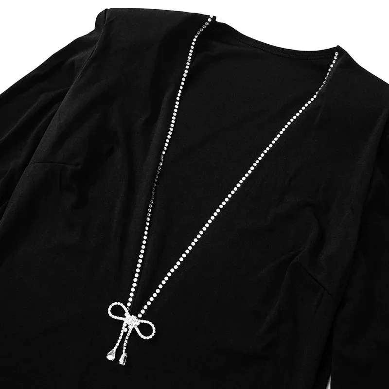 Radiate effortless sophistication with the diamond bow embellished mini dress, a true showstopper designed for glamorous evenings. This chic piece features a plunging V-neckline that exudes elegance, beautifully accentuated by a sparkling diamond bow embellishment. The intricate bow detail adds a dazzling focal point, elevating the dress with a touch of opulence.