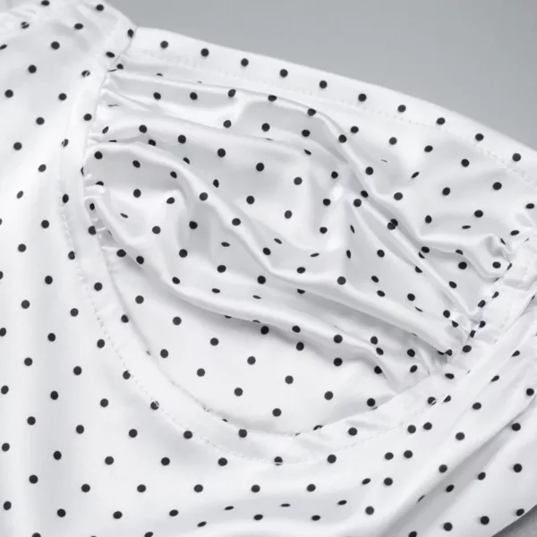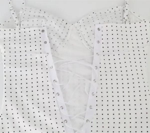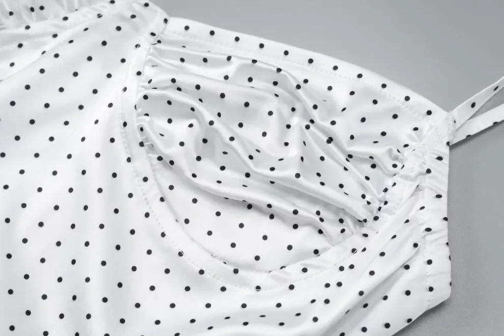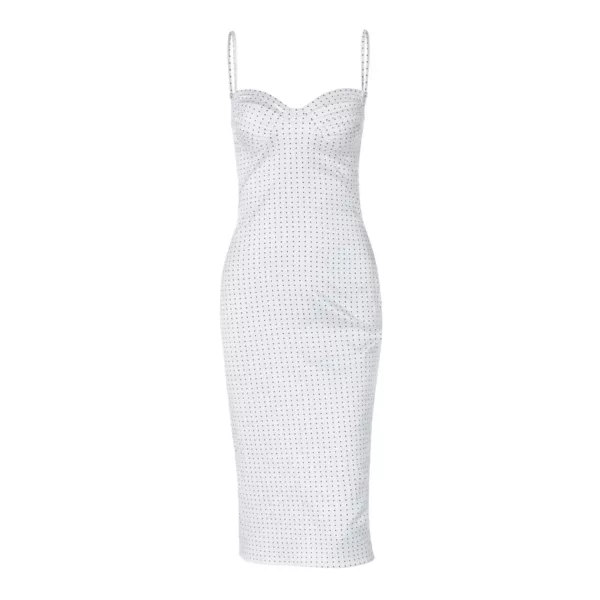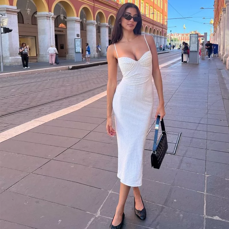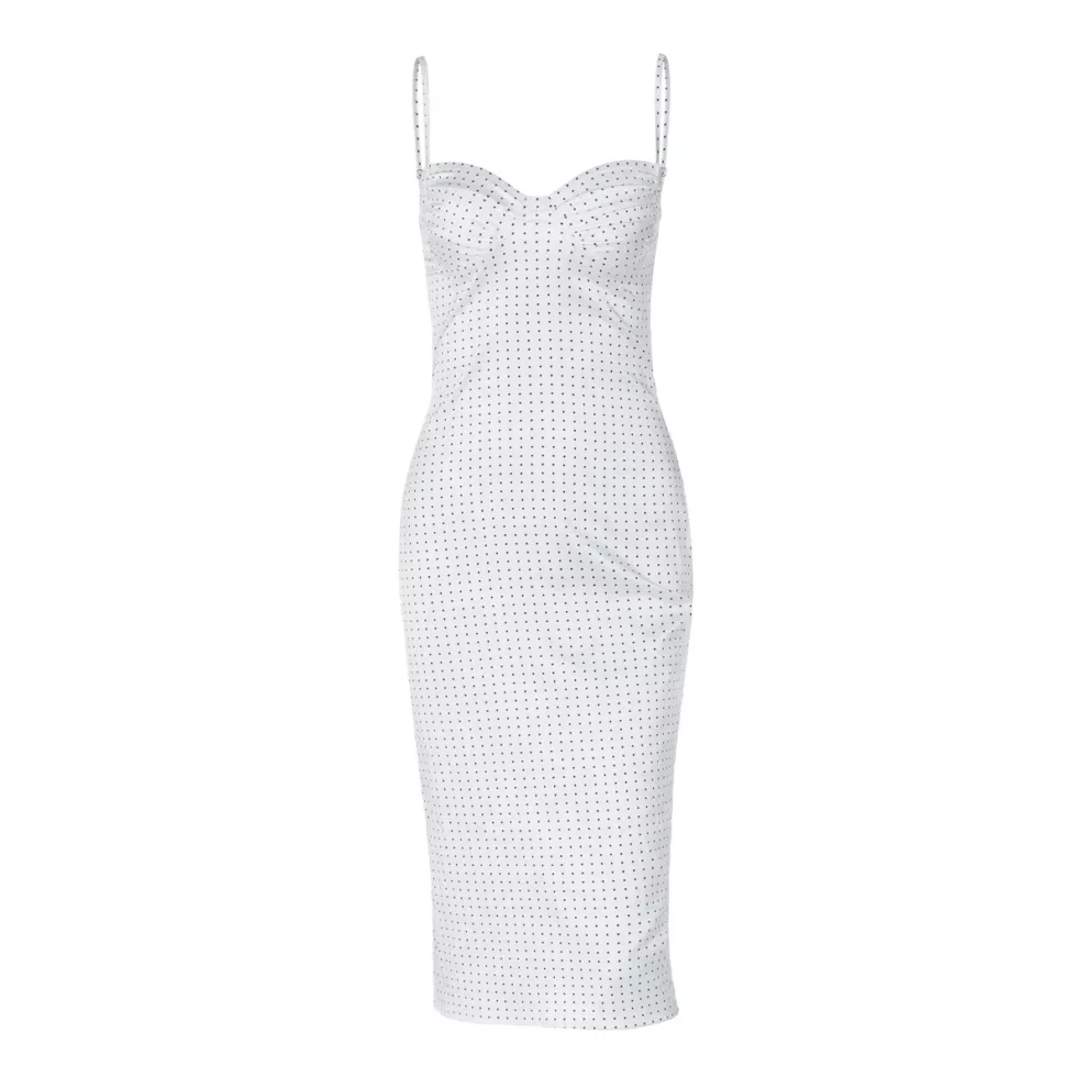 This dotted spaghetti strap midi dress is the definition of timeless elegance with a modern edge. Designed to flatter the figure with a sleek, form-fitting cut, this midi-length silhouette brings instant sophistication to your wardrobe. The sweetheart neckline adds a soft romantic charm, while the delicate spaghetti straps give it an understated, barely-there elegance that’s effortlessly chic.