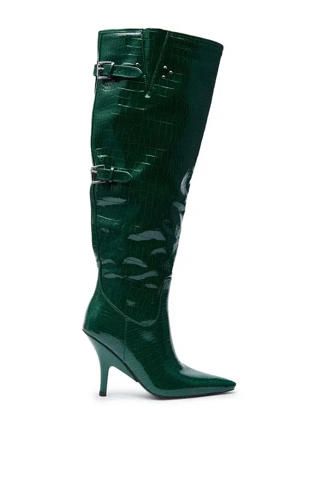 Designed to command attention, these emerald croc boots combine sharp tailoring and high-shine texture, delivering a confident statement for nights out and elevated day looks.