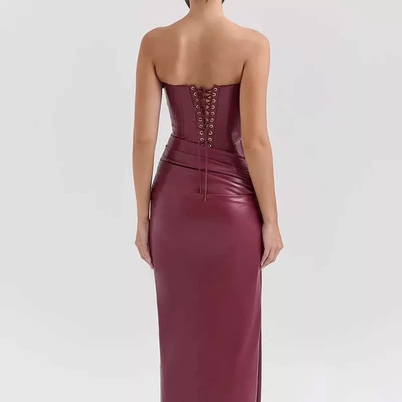 Step into the spotlight with this faux leather strapless dress that redefines modern elegance. Designed to sculpt and enhance, the corset-inspired bodice now features intricate lace-up detailing at the back, allowing for a customized, figure-hugging fit. This thoughtful addition enhances the dress’s allure while offering adjustable comfort.