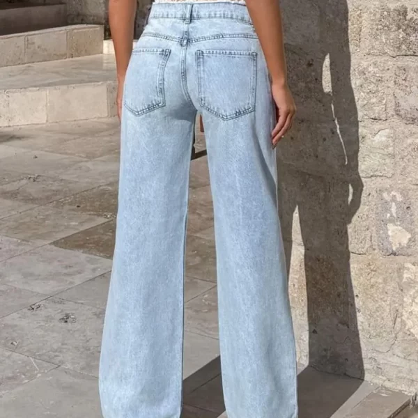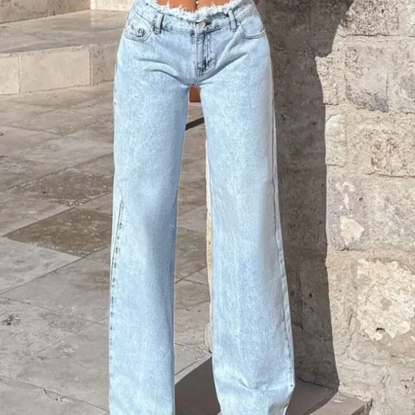 High waisted wide-leg jeans with a raw frayed waistband and relaxed fit. Crafted from light wash denim, they balance comfort and edge, perfect for casual days or statement styling.
