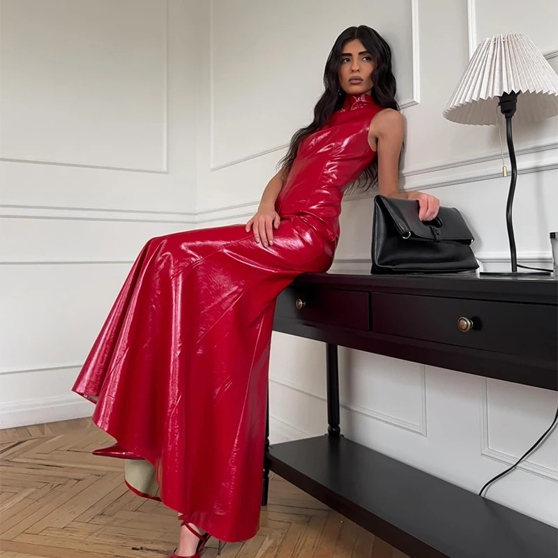This glossy vinyl halter maxi dress sculpts the body with precision and fluid shine, pairing timeless sophistication with high-gloss evening allure.