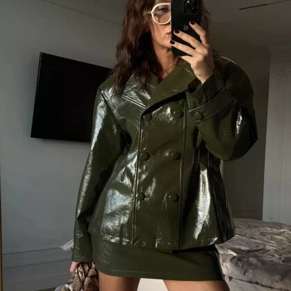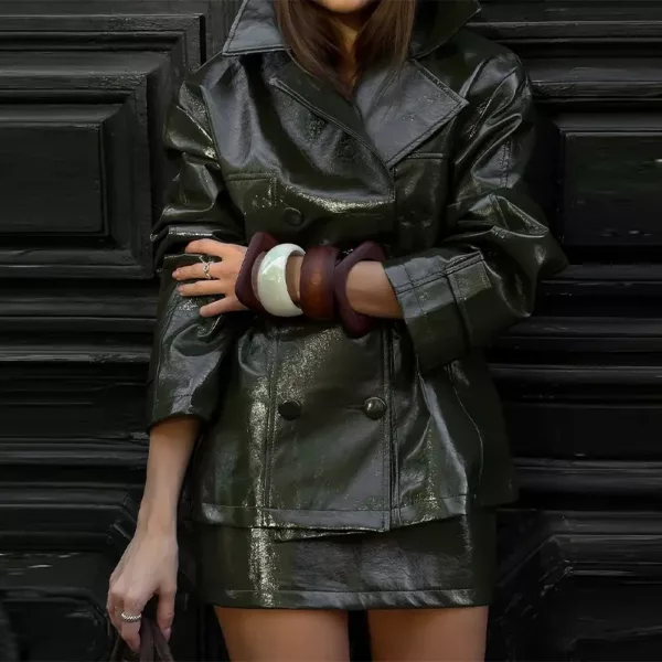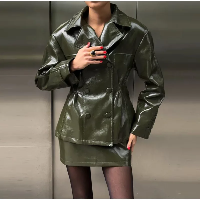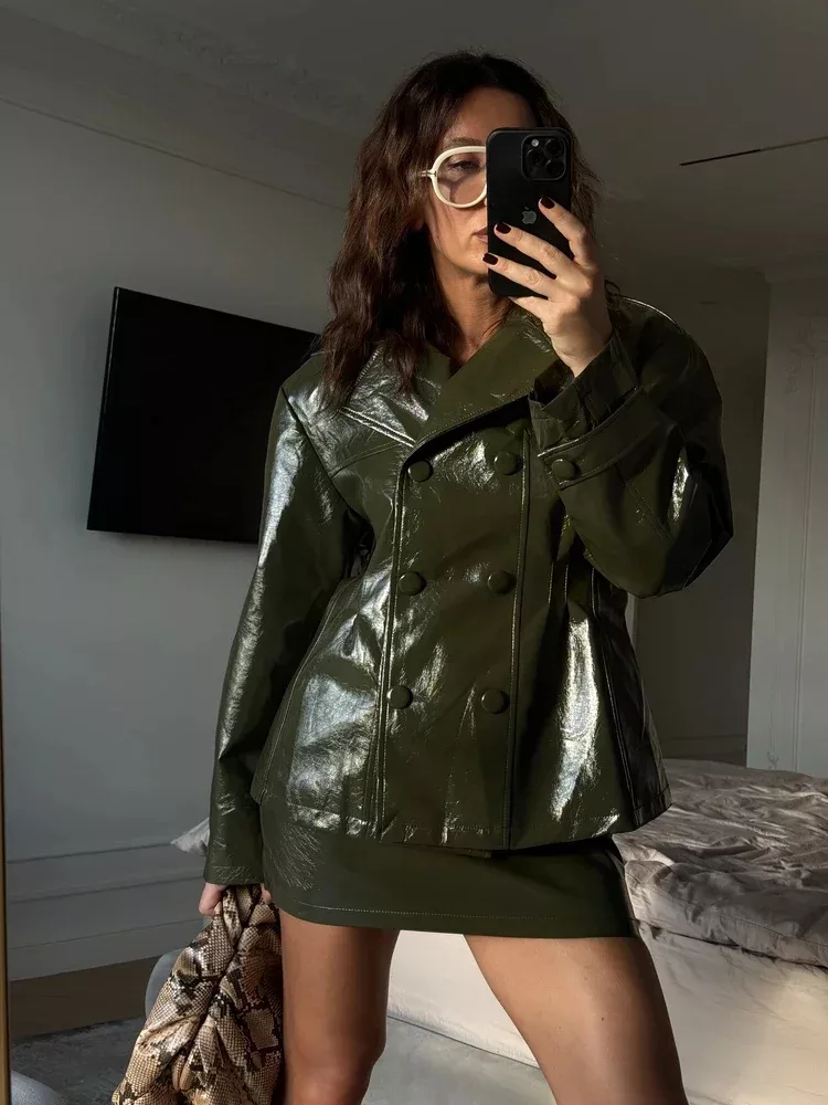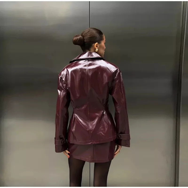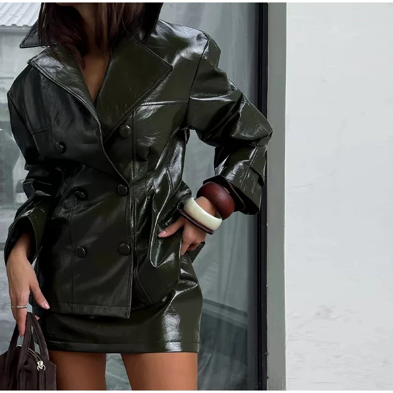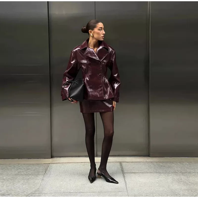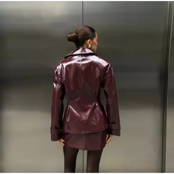 The double-breasted jacket features a sharp lapel, slightly relaxed fit, and long sculpted sleeves with adjustable cuffs. The body is shaped with strategic seams that create an hourglass line without clinging. Paired with the matching vinyl mini skirt, the look is clean, architectural, and instantly editorial. Together, they create an image of precision, a silhouette that feels both daring and composed.