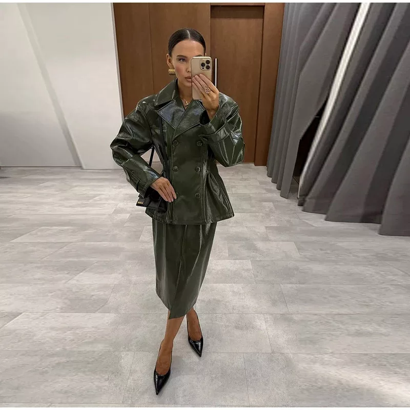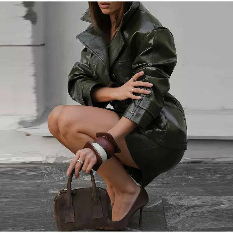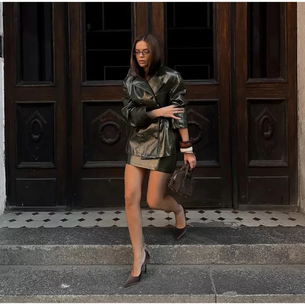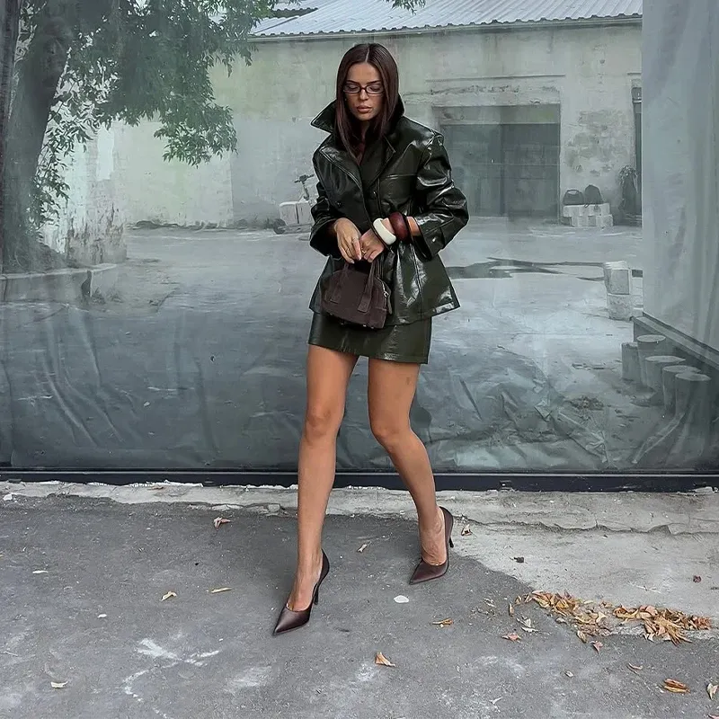- City Sharp: Olive jacket, leather trousers, and glossy pumps for a tonal statement.