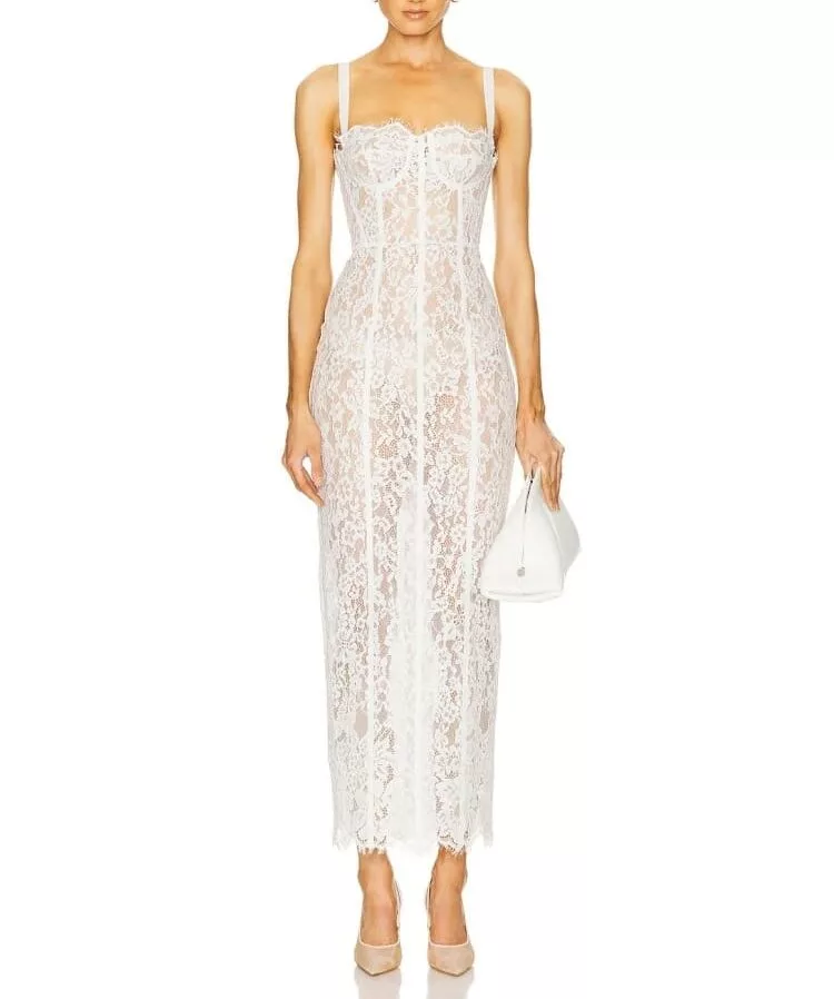 The true beauty of this dress lies in its meticulous details. The delicate lace, woven with exquisite precision, forms a captivating pattern throughout the garment. A classic sweetheart neckline frames your décolletage, complemented by slender spaghetti straps that add to its minimalist yet impactful design. The bodice features a subtle corset-like structure, enhancing the silhouette and providing a flattering fit. This harmonious blend of intricate texture and sleek design makes it a true work of art, perfect for those who appreciate refined craftsmanship.