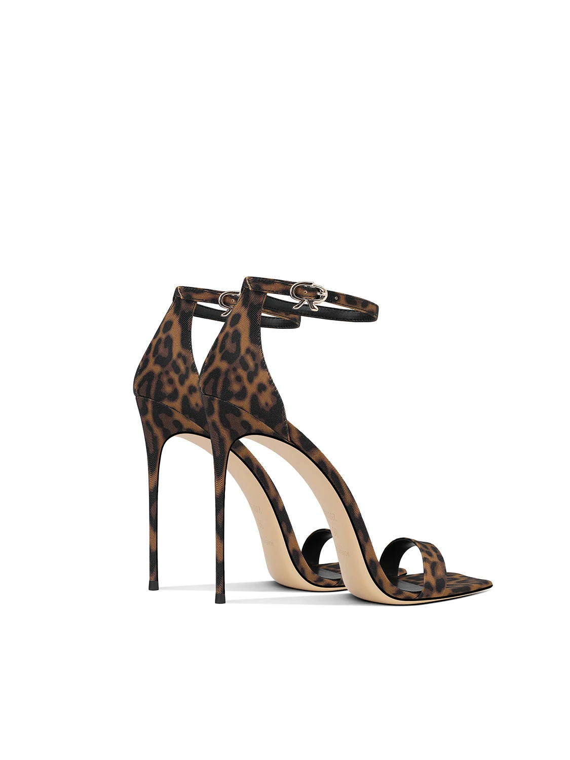 Crafted with a sleek, structured finish, the upper is wrapped in an all-over leopard print that adds exotic flair without overwhelming the minimalist lines. A slim toe strap leaves the front of the foot exposed, while the barely-there ankle strap closes with a delicate, adjustable buckle for a customized fit. The high-back heel cup lends stability and sophistication to the open structure.