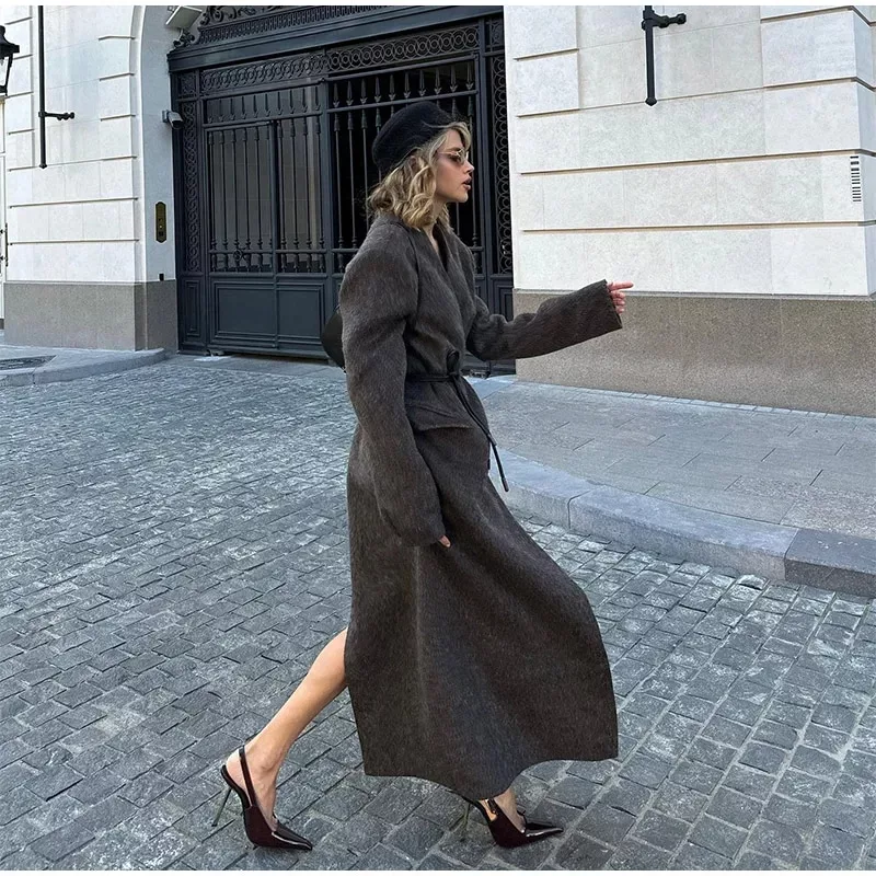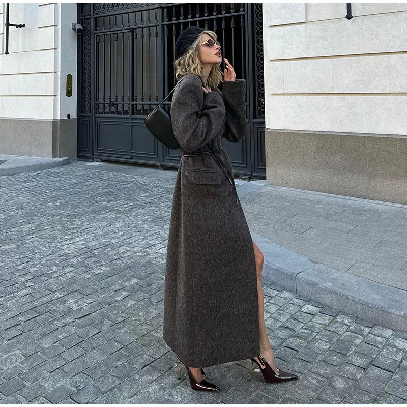 Designed with meticulous attention to detail, the Urban Long Gray Belted Coat includes a matching waist belt that cinches at the waist, enhancing your figure and creating a feminine, polished look. The decorative pockets add a refined touch to this high-street overcoat, offering a seamless blend of practicality and style. Its soft yet durable fabric ensures comfort while maintaining a structured look, ideal for layering over your favorite outfits this season.