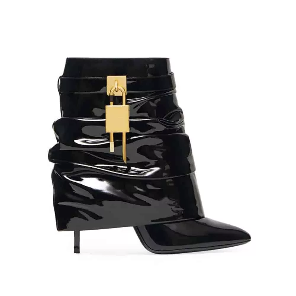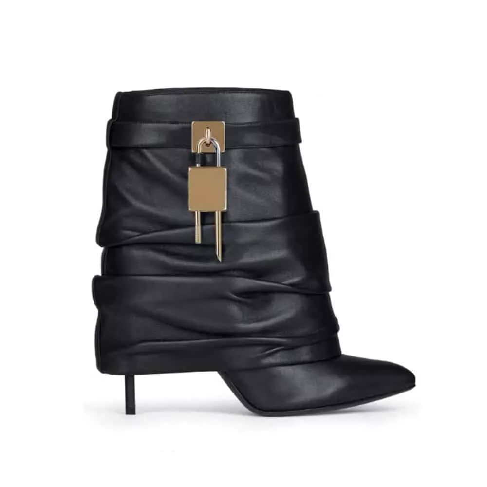 The defining feature of these stylish high heeled shoes is the metallic lock embellishment, attached to a minimalist strap encircling the ankle. This contemporary detail adds a distinctive edge, making these boots a versatile statement piece for your wardrobe.