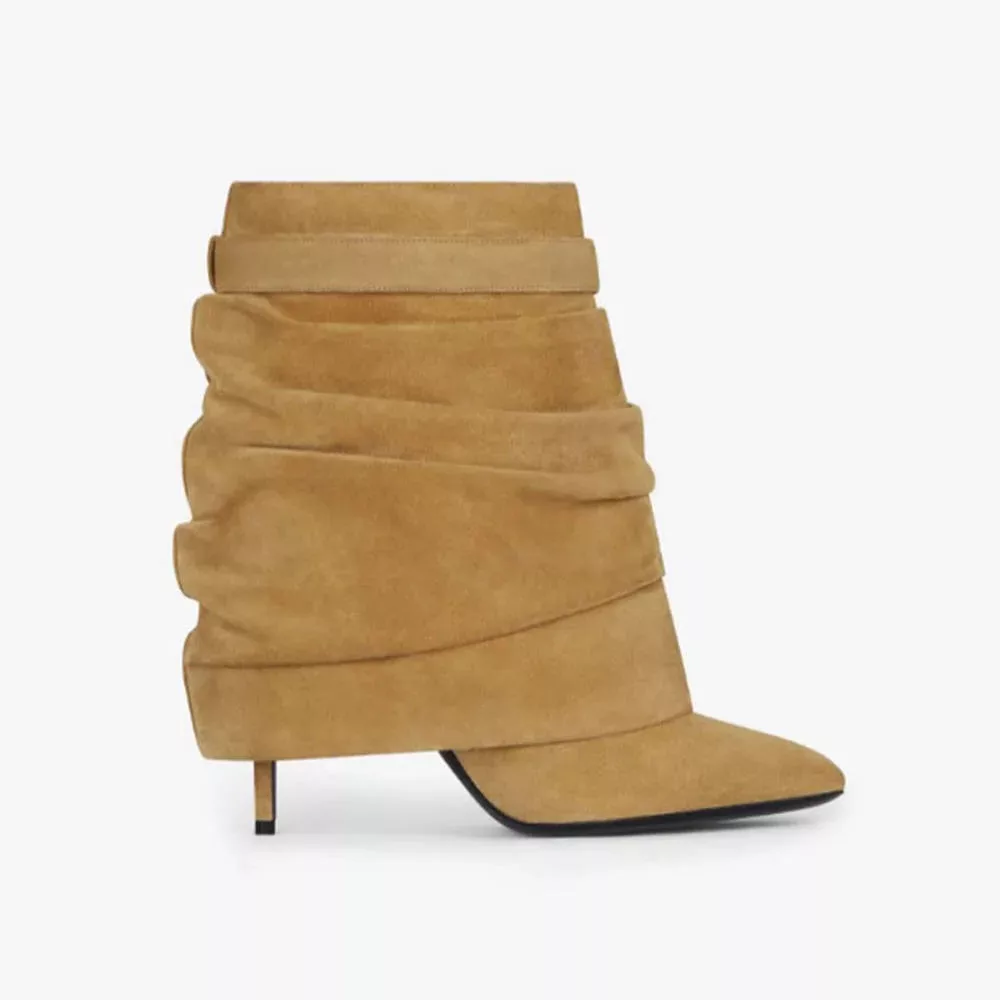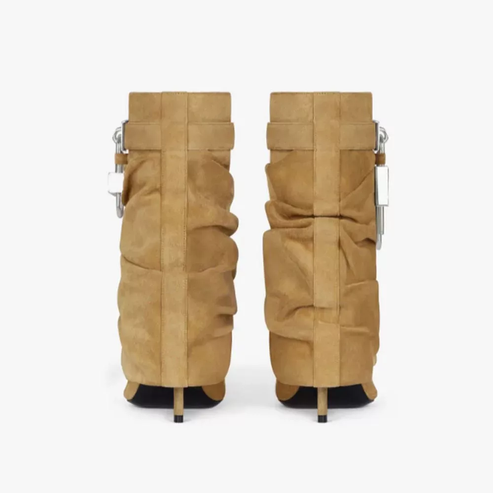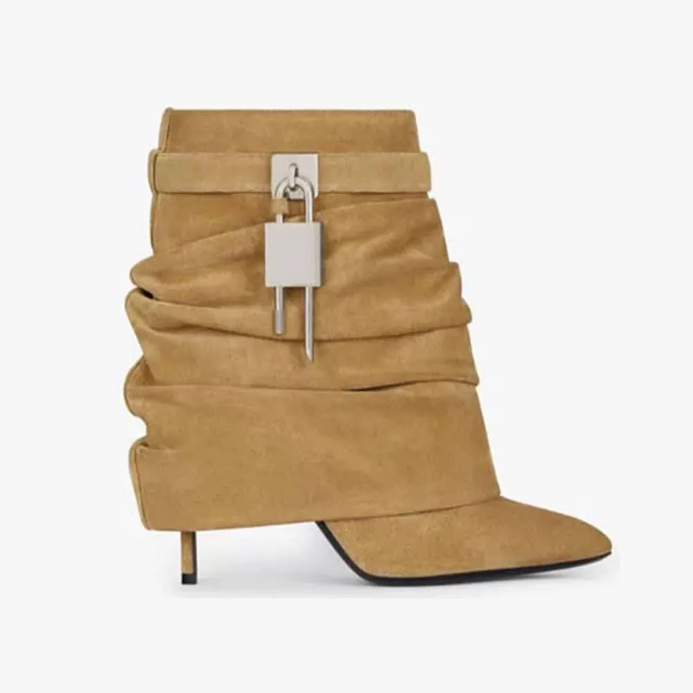 Step into sophistication with these metallic lock ankle boots, a perfect blend of elegance and modern flair. Designed with a slouchy suede silhouette in a warm camel hue, these boots radiate understated luxury. The pointed toe elongates the leg, creating a sleek and polished profile, while the slender stiletto heel adds a refined touch to elevate any ensemble.