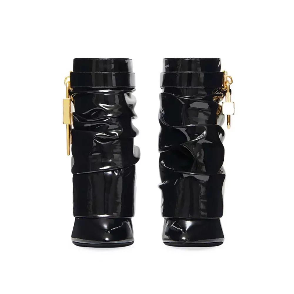 Pair the metallic lock ankle boots with tailored trousers for a semi-formal outfit, or wear them with a midi skirt and cropped jacket for a casual yet sophisticated look. The warm camel shade is ideal for transitional seasons, while the black vinyl version brings a dramatic edge perfect for evening outings.
