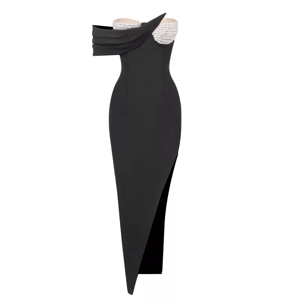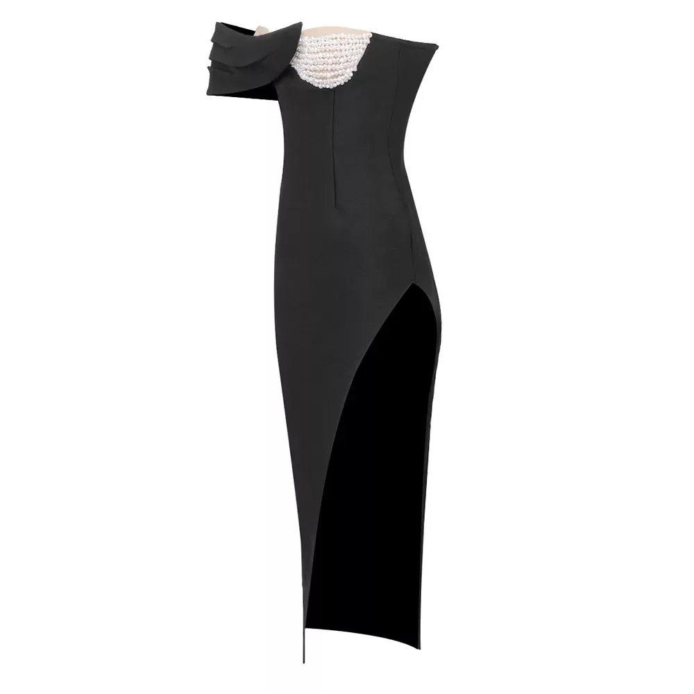 Elevate your evening style with the Off Shoulder Black Bandage Dress with High Split and Pearl Accents, a perfect blend of sophistication and modern allure.