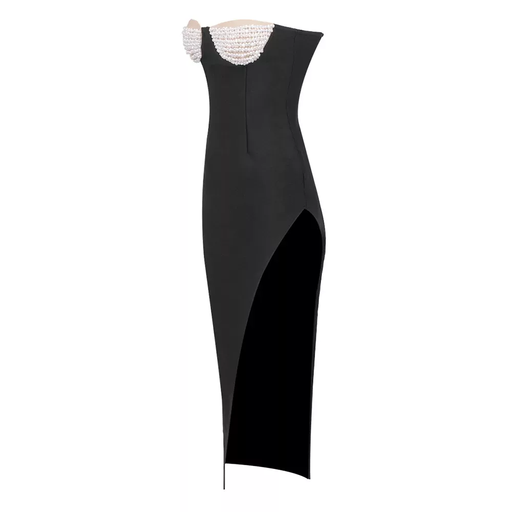 Step into timeless elegance with the Off Shoulder Black Bandage Dress with High Split and Pearl Accents. This striking piece combines the allure of an off-the-shoulder silhouette with the refined sophistication of pearl embellishments, making it the perfect addition to your evening wardrobe. The dress hugs your figure in a sleek bandage design, ensuring a flattering fit that accentuates every curve. The luxurious pearls adorning the bust area add a touch of opulence, creating a focal point that elevates the overall look.