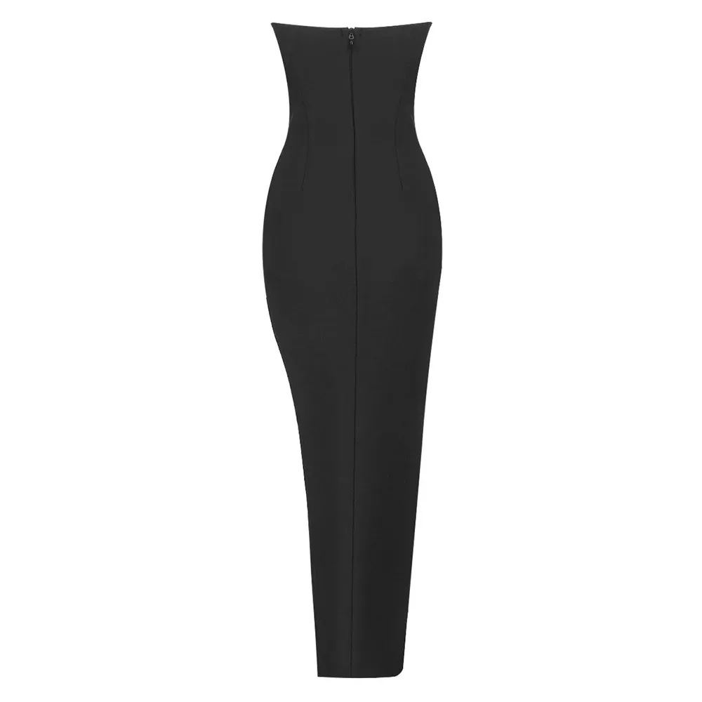 The daring high side slit brings an element of drama, elongating the legs and adding movement to the dress, while the off-shoulder neckline exudes femininity and grace. Crafted from high-quality, form-fitting material, this dress is both comfortable and chic, making it ideal for a variety of formal occasions, from gala dinners to red carpet events. The Off Shoulder Black Bandage Dress with High Split and Pearl Accents pairs perfectly with stiletto heels and understated jewelry, allowing you to make an unforgettable entrance.