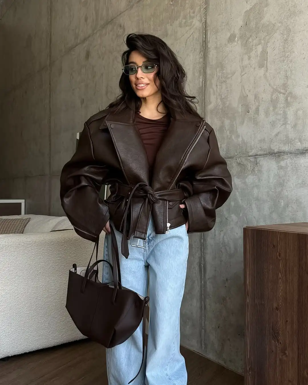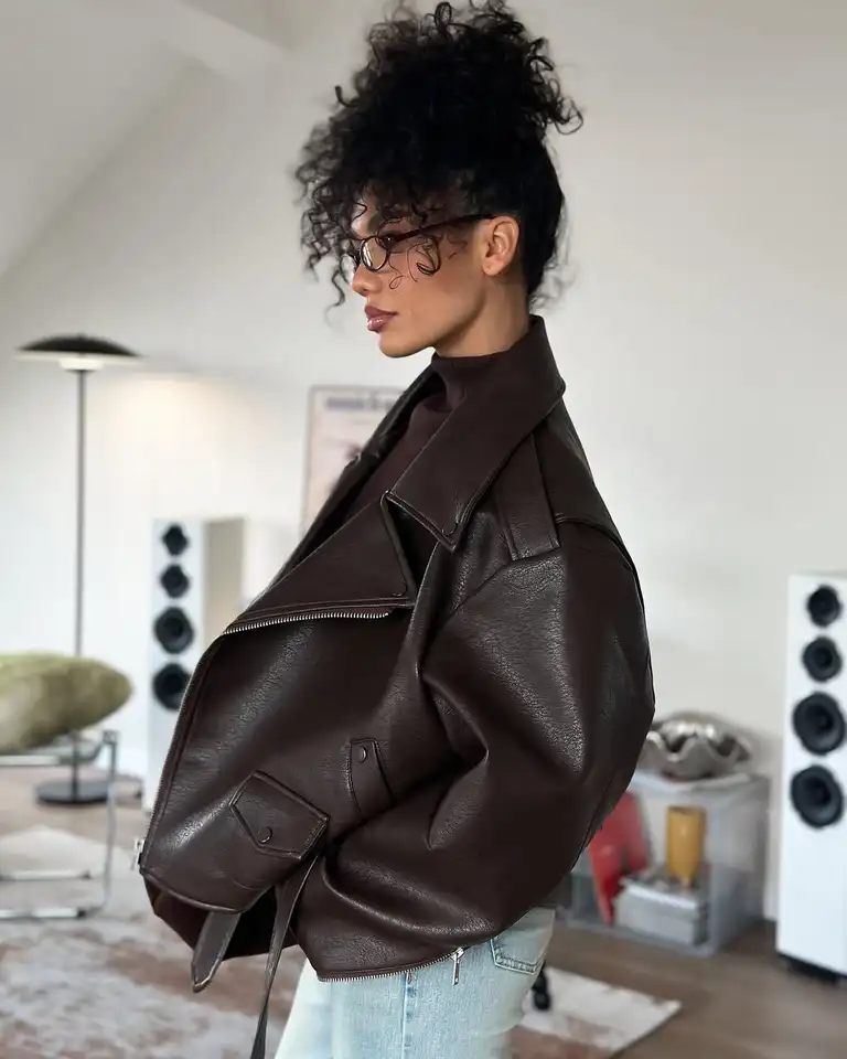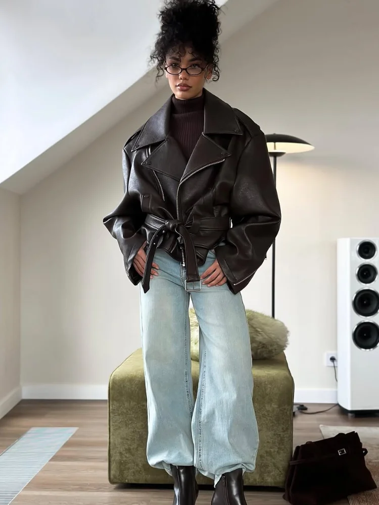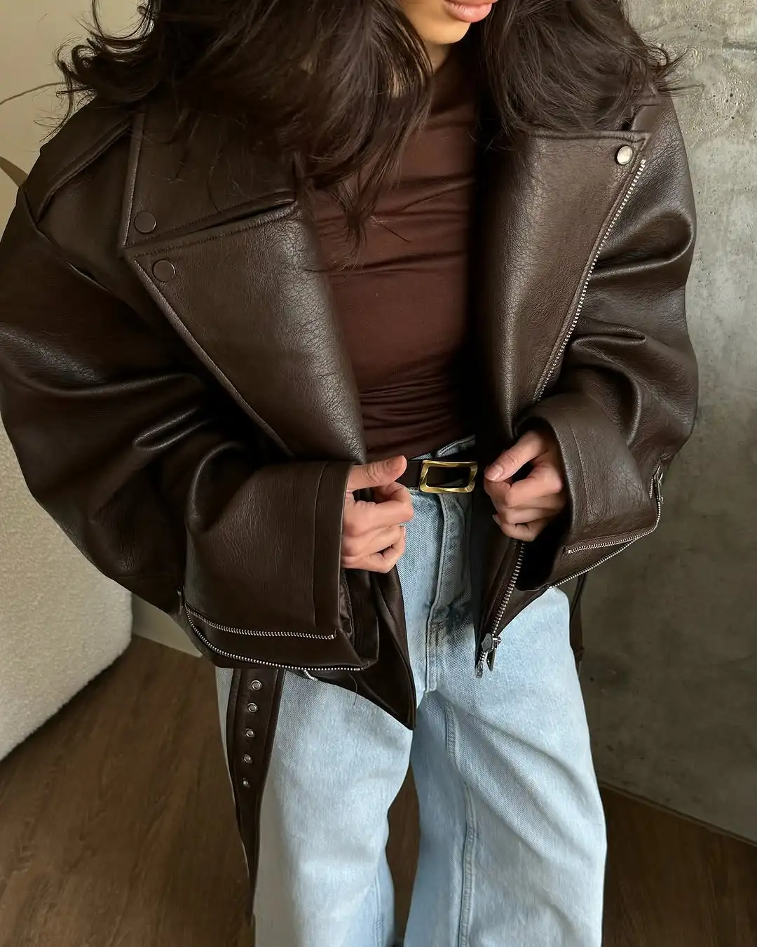 An oversized brown faux leather jacket with silver zippers and a belted waist. Sculptural shape, soft texture, and modern ease for everyday statement dressing.